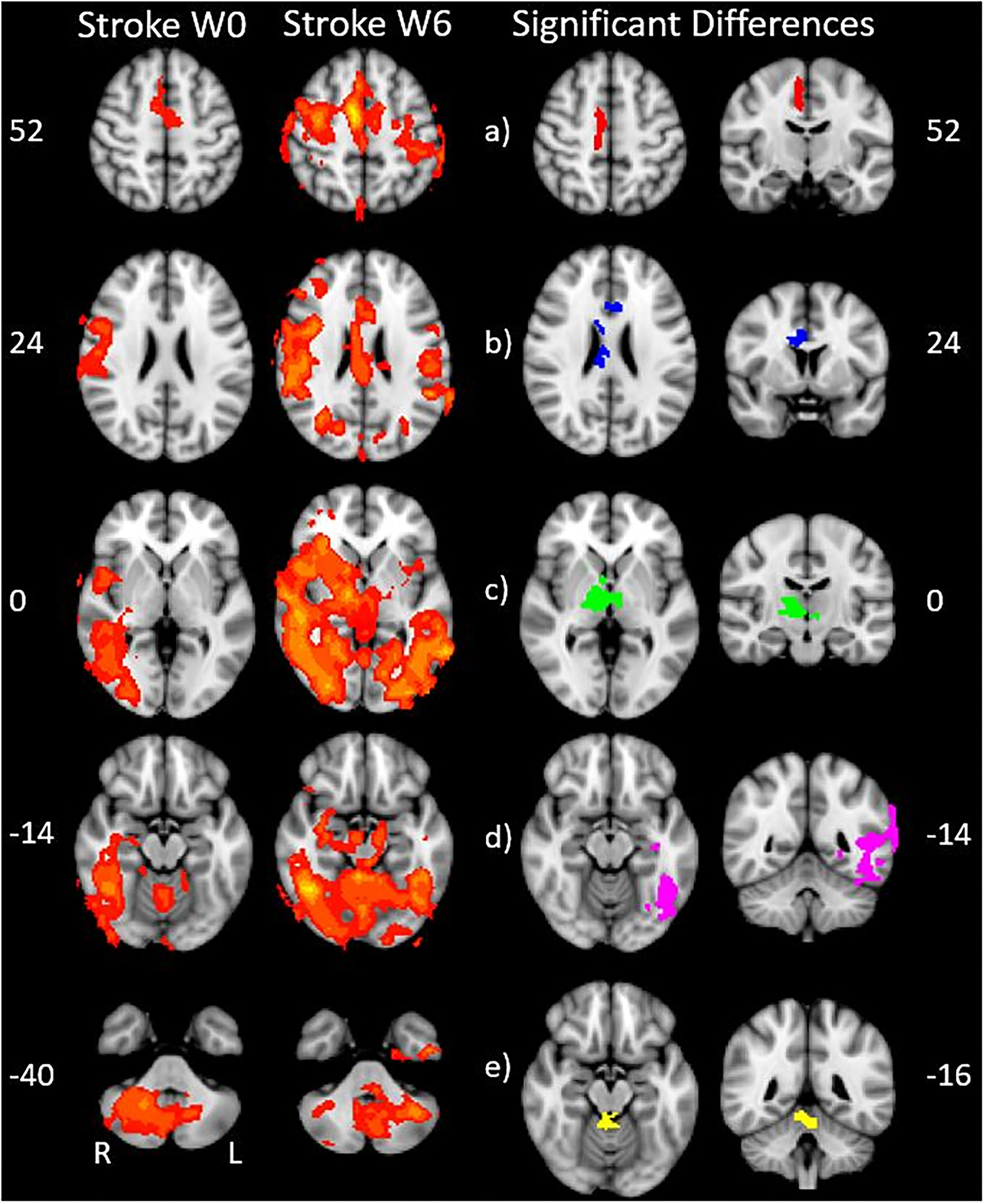 Within the stroke group, the activation images at time-point W6 were compared to the activation images at time-point W0, and the voxels where W6 was >W0 defined our volume of interest. These regions were further subdivided using the Jülich Histological Atlas for supratentorial regions and the Taliarch Daemon Label Atlas for cerebellar regions, and the number of active voxels and the intensity of each region was recorded.