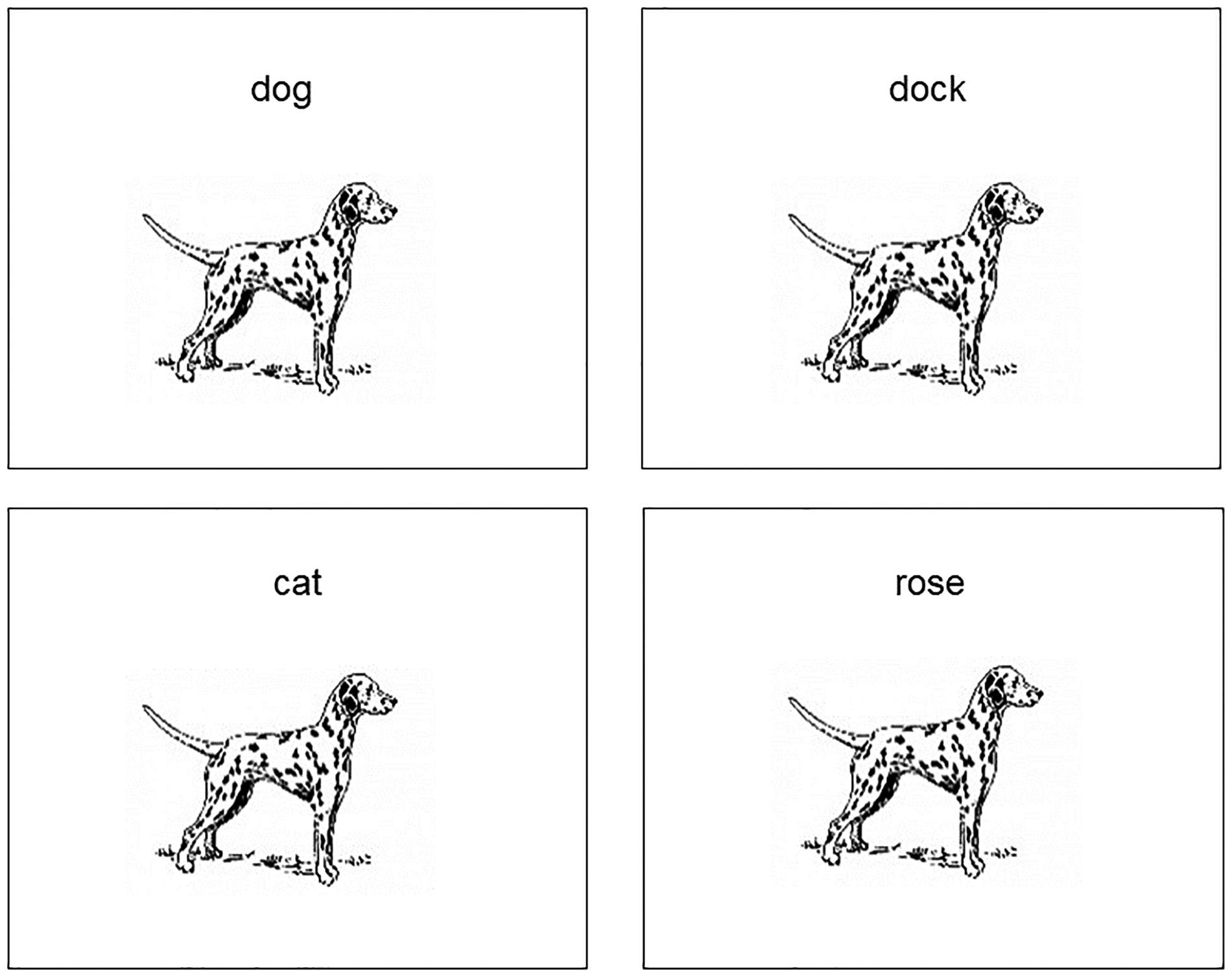 Example of separate rWPVT trials for a single picture with the target (top left), phonological foil (top right), semantic foil (bottom left), and unrelated foil (bottom right).