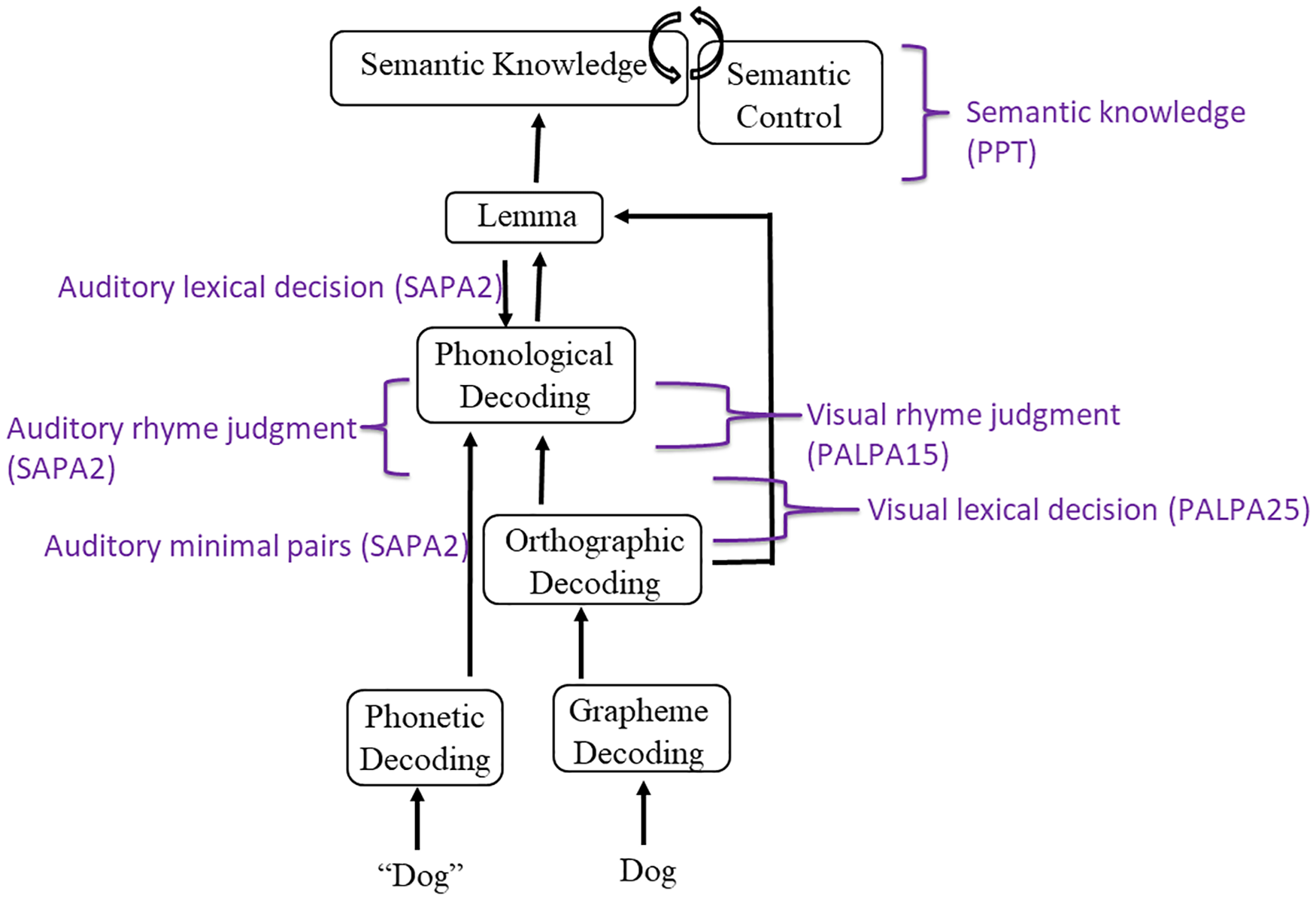 Three tasks investigating receptive phonological processing were completed by IWAs based on the levels of phonological decoding included in our model (See Figure 2). According to Martin and Saffran (35), minimal pair processing reflects the mapping of acoustic/phonetic information onto phonemic/phonological codes. Auditory rhyme judgment targets acoustic-to-phoneme mapping at a later decoding stage compared to minimal pairs and requires manipulation of the phonological form. Auditory lexical decision is believed to assess the mapping of phonological to lexical representations. Subtest 2 from the Standardized Assessment of Phonology in Aphasia (SAPA2) (36) was administered to provide a measure of auditory-based phonological processing skills. Four sections comprises SAPA2, assessing real word and non-word rhyme judgment, lexical decision, and minimal pair judgment.