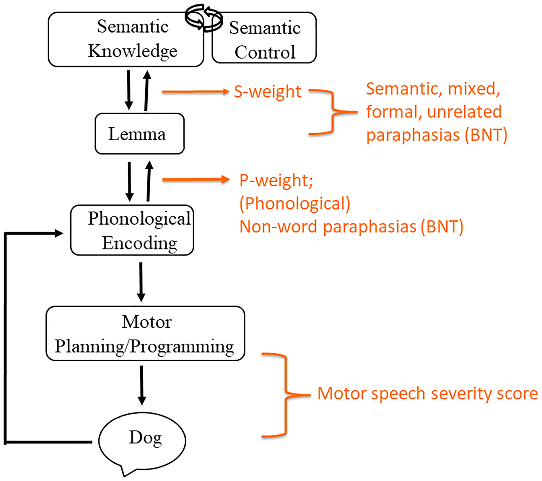 Semantic, phonological, and mixed errors along with non-word and unrelated errors were used in the calculation of s-weight and p-weight, which are measures of the connection weights between the semantic and lexical level as well as the lexical and phonological level, respectively. These weight connections are based on Dell’s interactive activation model of lexical retrieval (14), wherein a picture name is ultimately selected depending on the degree of automatic spreading activation between the conceptual, lexical, and phonological language production stages. A low s-weight is indicative of a semantic-based impairment, or an impairment linking the semantic and lexical levels, resulting in more semantic-based errors in naming. Likewise, a smaller p-weight is indicative of a more phonological-based impairment, with more non-word (and phonological paraphasias) observed compared to semantic paraphasias during naming (34, 49). Calculation of s- and p-weights was completed with the assistance of an online calculator (http://www.cogsci.uci.edu/∼alns/webfit).