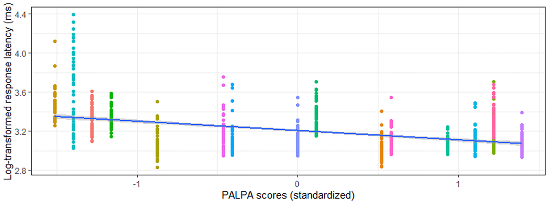 Linear mixed effect and logistic mixed effect models were used to investigate how established measures of language processing predicted WPVT accuracy and response latency using packages lme4 (55) and lmerTest (56) in rStudio (R v. 3.6.3).