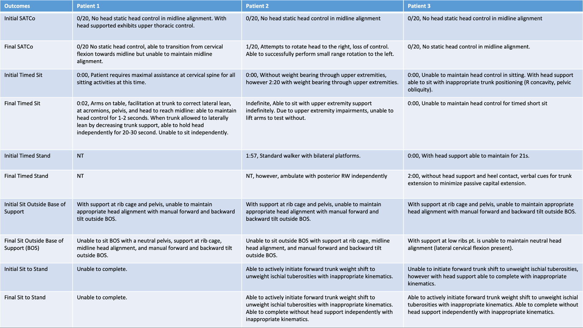 Initial and final outcomes across all three patients for head control, scoliosis, SATCo, timed sit, timed stand, sit outside base of support, and sit to stand.