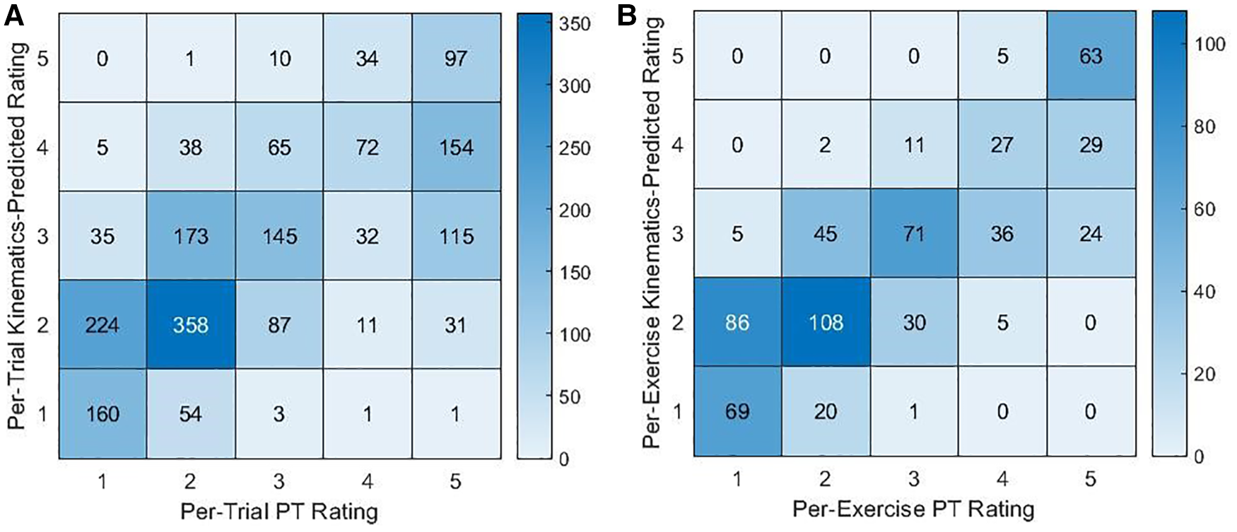 Figure 4. Contingency tables for the counts of PT ratings and (A) per-trial or (B) per-exercise kinematics-predicted ratings.