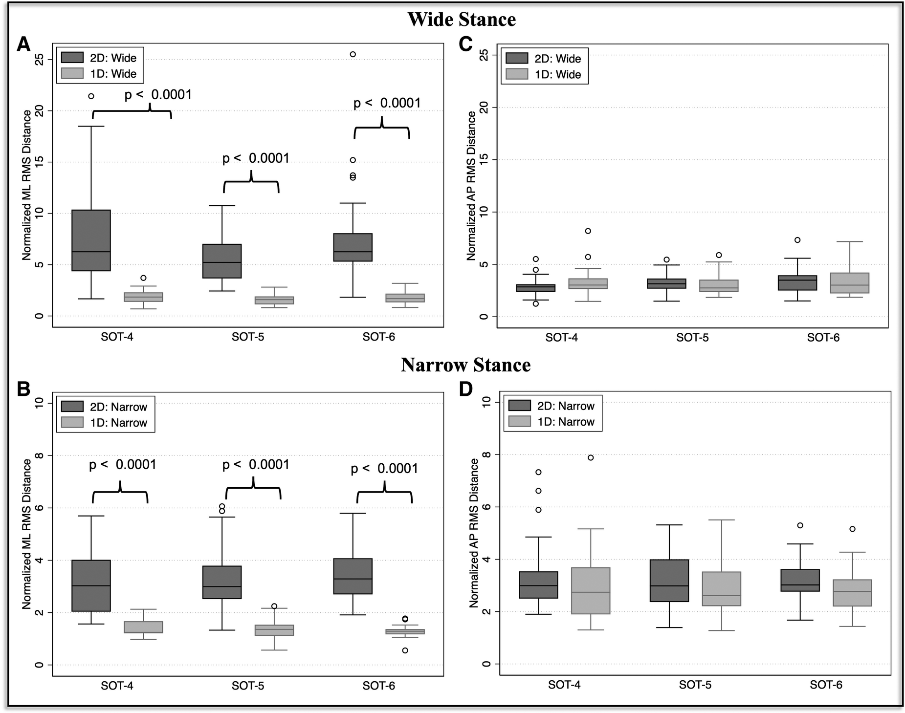 Figure 5. The median and interquartile range (IQR) is shown for each of the mediolateral (A, B) and anteroposterior (C, D) normalized sway ratios. Ratios were calculated by dividing the RMSD in the sway-referenced conditions by the RMSD in the corresponding condition that included a stable support surface: SOT-4/SOT-1, SOT-5/SOT-2, and SOT-6/SOT-3. In each plot, the ratios calculated from the 2D trials (dark grey) are shown against the ratios calculated from the 1D trials (light grey). P-values reflects the results of a Wilcoxon Rank Sum test of medians between the 1D and 2D sway-reference conditions. P-values are Bonferroni corrected (corrected according to 6 comparisons for wide stance and 6 comparisons for narrow stance).