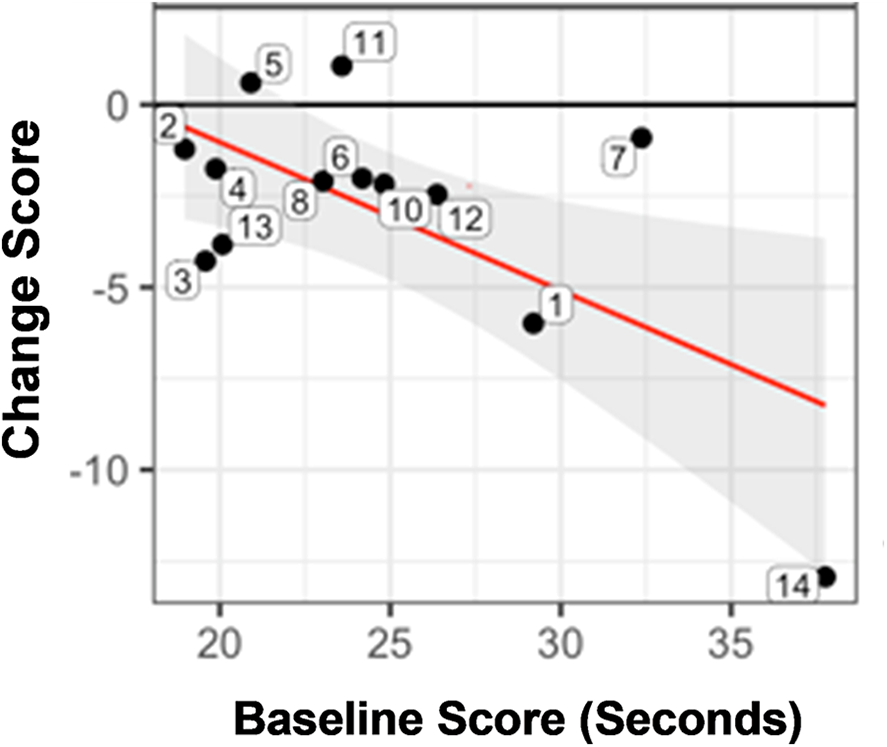 The cTOL showed that 77% had a gain in score (Figure 2). The improvement in score (i.e., higher negative number for the change score) was, in general, greater for those with a worse baseline performance (longer time to complete at pre-treatment). An example of this is subject 14 (lower, right corner of Figure 2), who had the greatest change score (improvement) at post-treatment, but began at pre-treatment with the longest time (worst performance) to completion at pre-treatment.