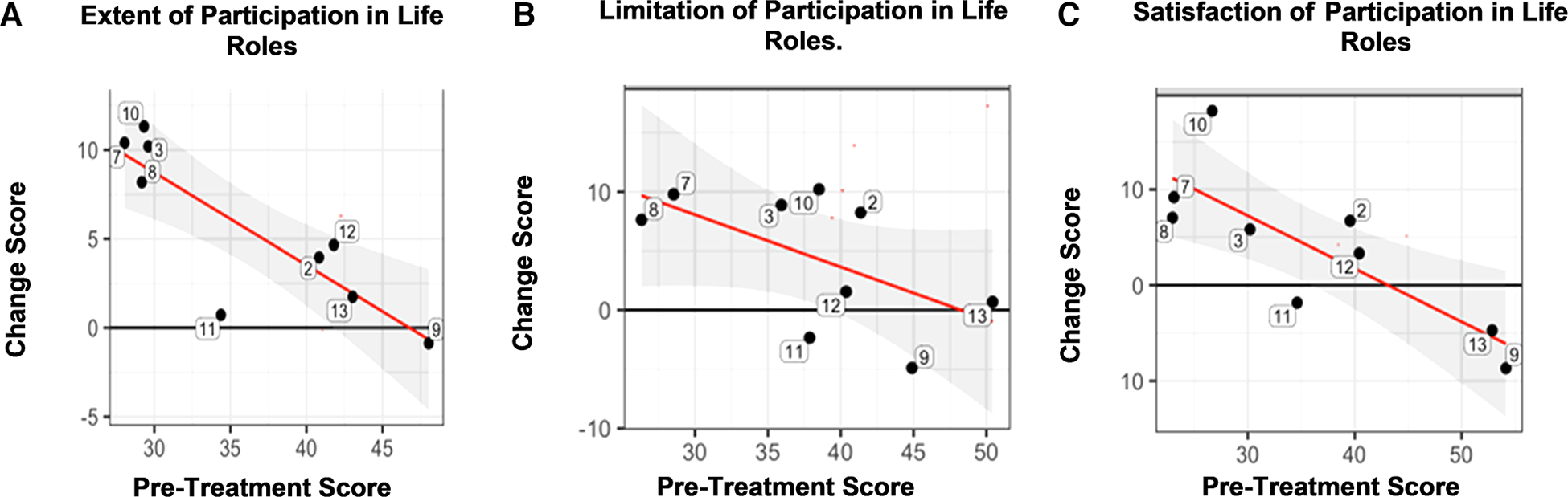 Figure 3. Community Reintegration of Service Members (CRIS). Panel A. There was a statistically significant improvement according to the CRIS subdomain of Extent of Participation in Life Roles, which showed that, in general, those with the lowest baseline score (horizontal axis), showed greater improvement (vertical axis) in comparison to those with higher baseline scores. The horizontal axis is the pre-treatment score and the vertical axis is the change score. Panel B. There was a statistically significant improvement according to the CRIS subdomain of Limitation in Life Role Participation, which showed that, in general, those with the lowest baseline score (horizontal axis), showed greater improvement (vertical axis) in comparison to those with higher baseline scores. The horizontal axis is the pre-treatment score and the vertical axis is the change score. Panel C. The CRIS subdomain of Satisfaction in Life Role Participation showed that, in general, those with the lowest baseline score (horizontal axis), showed greater improvement (vertical axis) in comparison to those with higher baseline scores. The horizontal axis is the pre-treatment score and the vertical axis is the change score. Key: Black horizontal line (y = 0) represents no change from post- minus pre-treatment scores. Red regression line summarizes the conditional change at post-treatment given the pre-treatment measure. Gray shaded area shows the 95% confidence interval associated with the red regression line.