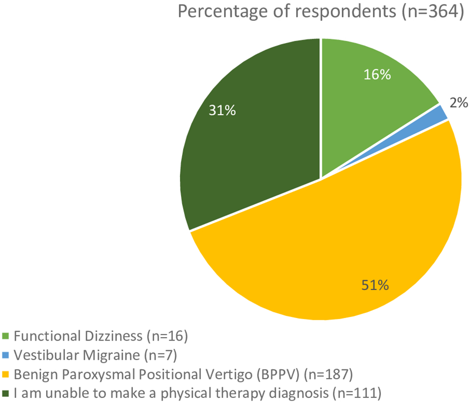 The second clinical vignette asked the respondents for their diagnosis of a patient with subjective dizziness without nystagmus in response to positional testing. Overall, 187 (51%) respondents selected subjective BPPV, 111 (31%) were unable to make a diagnosis, and the remainder chose vestibular migraine and functional dizziness (Figure 5). In the 111 who could not make a PT diagnosis, 87 would refer this patient to another provider. There was not a significant difference in response rates based on years of experience (t = 1.39, p = 0.13). Based on practice setting, 30% of those in an academic/research setting, 44% of acute care, 42% of those in home health, 31% of those in school, 61% of those in outpatient neurologic/vestibular, 59% of those in outpatient orthopedic, and 67% of those in sports settings diagnosed the patient with BPPV. There was not a significant difference in response rates based on clinical practice setting [H(5) = 4.36, p = 0.36]. There were 40% of those in academic/research, 36% in acute care, 42% of those in home health, 13% in school, 41% of those inpatient rehabilitation, 29% in outpatient neurologic/vestibular, and 23% of those in outpatient orthopedic settings were not able to make a physical therapy diagnosis. The providers they would refer to include Otolaryngology, Neurology, Primary Care, Vestibular Physical Therapy, and Audiology.