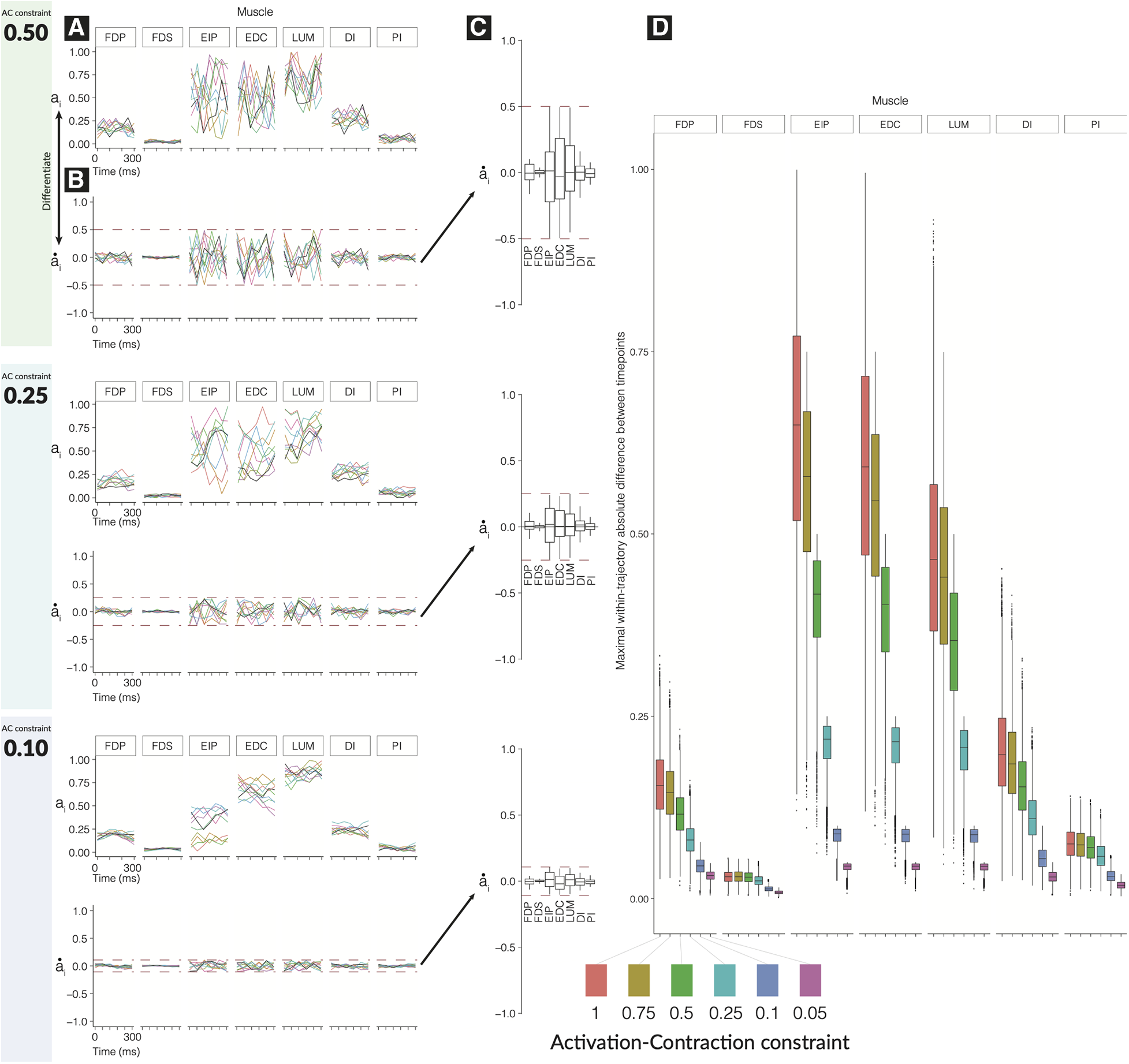 Effect of tightening constraints on the feasible trajectory space. We show 10 sample trajectories (from the 10,000 computed) for each of three levels of activation-contraction constraints. For each activation-contraction level, we show (A) sample trajectories, where each color is a different trajectory. (B) Those trajectories, differentiated to show how quickly the activations were changing with the upper and lower activation-contraction constraints shown as dotted lines, and (C) the full distribution () of the trajectory “activation-contraction speeds,” grouped by muscle. Note that colors on (C) do not relate to (A) and (B). Outliers are not shown on (C). In (D), we show the effect of differing activation-contraction constraints on the distribution of , compared across muscles. When we sample trajectories, we get -dimensional trajectories, with muscles. From each of those trajectories, we differentiate them (e.g., ), and we show here the distributions of, e.g., . These speeds are grouped by the applied activation-contraction constraint. The case with no activation-contraction constraints is a ; a means a muscle is spatiotemporally constrained so that it cannot change by more than 10% within 50 ms.
