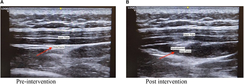 The intervention was performed by a registered musculoskeletal sonologist who has been performing musculoskeletal ultrasounds for more than ten years. Before the intervention, the sonologist palpated the tender nodule to locate the injection site. An ultrasound machine (GE Logic Q) with a linear transducer (5–13 MHz) was used to visualize the fascia during the procedure. Participants were seated with their necks flexed. Topical anesthetic using lidocaine 2% prilocaine 2% (EMLA) cream with transparent film dressing (Tegaderm) on the target site and ice compress was applied for 30 min. Aseptic preparation of the needle insertion site was performed with Propanol Benzalkonium Chloride and sterile drapes. With the use of in plane approach, the sonologist injected the saline anesthetic solution (1 cc 2% lidocaine + 5 cc NSS) between the fascia of the trapezius muscle and the fascia of the muscle directly under it with ultrasound guidance. This was followed by applying direct pressure and dressing over the injection site. Figure 2 shows the pre and post procedure scan of the upper trapezius that underwent hydrodissection.