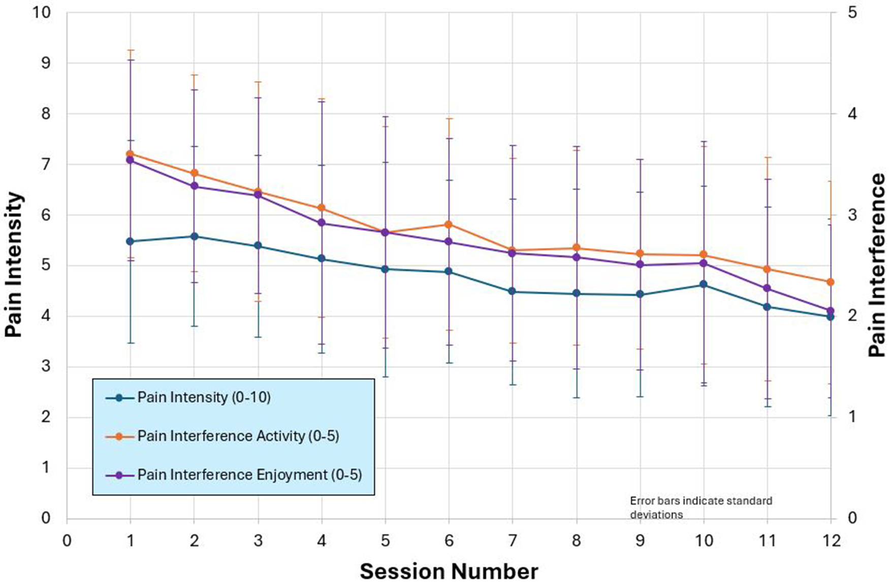 Treatment response to TBI Care was monitored weekly by the CM over the course of the 12-session intervention. At each session participants were asked to rate their pain intensity (0 = no pain, 10 = pain “as bad as you can imagine”) and interference of pain in two domains; day-to-day activities and enjoyment of life (1 = not at all, 5 = very much), with a goal of 2 or lower on both pain interference items (primary outcome). At every 4th session (sessions 1, 4, 7 & 10), the CM assessed for symptoms of depression, anxiety, and sleep difficulties to monitor change in co-occurring symptoms. Symptoms of depression were assessed using the Patient Health Questionnaire (PHQ)-2 or -9 (31), symptoms of anxiety were assessed using the General Anxiety Disorder (GAD)-2 or -7 (32), and sleep was monitored based on response to the sleep item on the PHQ-9.