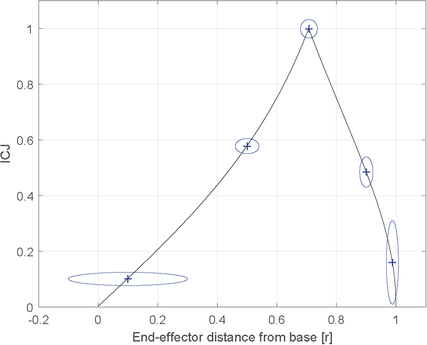 While Figure 4 shows the ICJ for different positions of the end effector, it does not provide tangible information about the resulting uniformity of the Cartesian damping, which would prove important in choosing the HAD's workspace. To this end, simulated torque values ranging from −1–1 Nm acting on both joints () have been applied and thanks to the Jacobian matrix, the Cartesian force values at the end effector were found. Figure 5 shows the results of the computation added to Figure 4 curve with equal length (l2/l1 = 1) to represent how the Cartesian force values (in the horizontal and vertical axes) differ. The force values are equal when the ICJ is equal to 1, and tend to differ as the ICJ gets smaller. For instance, at r = 0.5the vertical Cartesian force is 0.058 N and the horizontal force is 0.01 N, while at r = 0.707, both the vertical and horizontal forces are 0.0071 N. For a point even farther from r = 0.707, such as r = 0.1, the vertical force is 0.005 N and the horizontal force is 0.05 N.