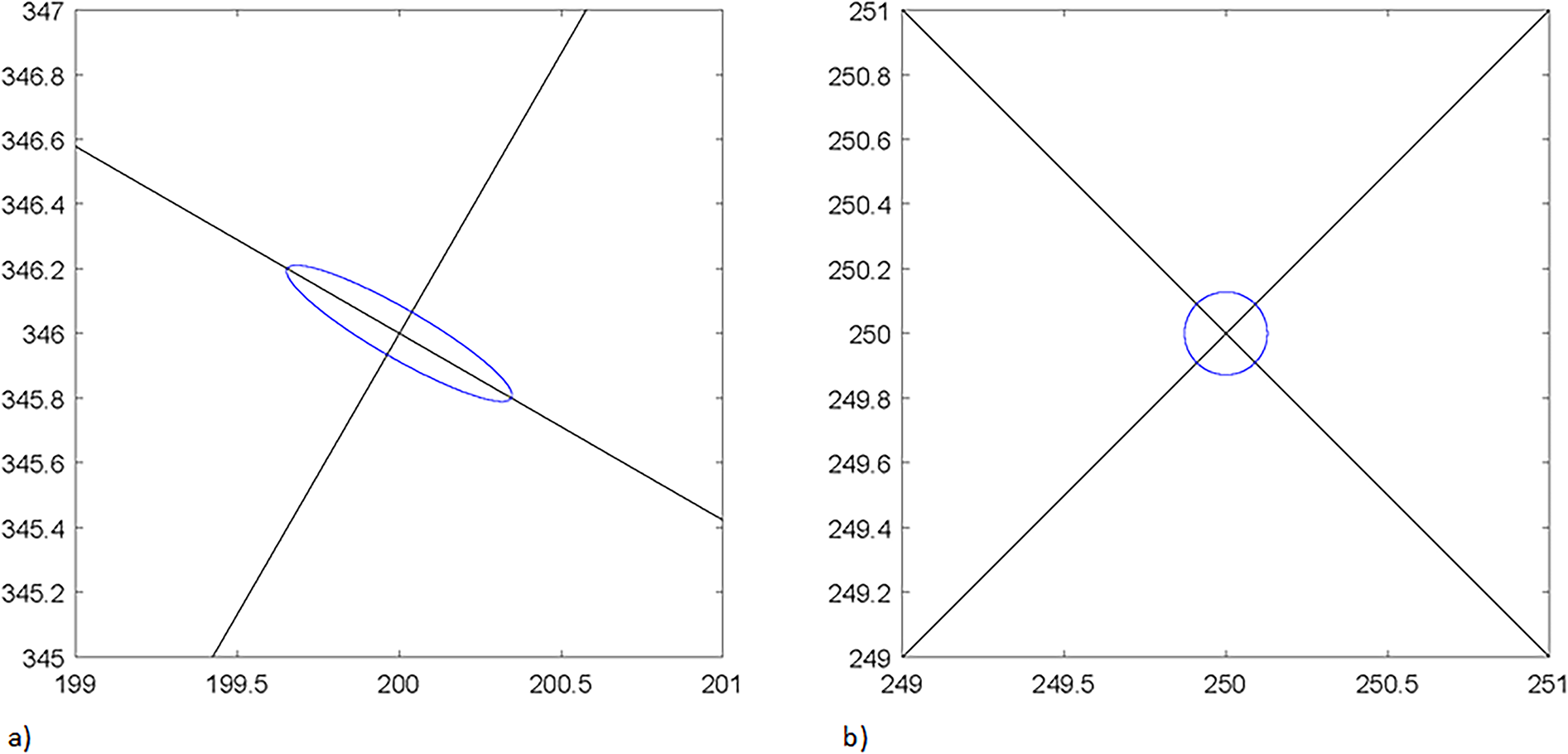 Ellipses of the eigen values and lines of the eigen vector; (a) at point (200; 346) (b) at point (250; 250).