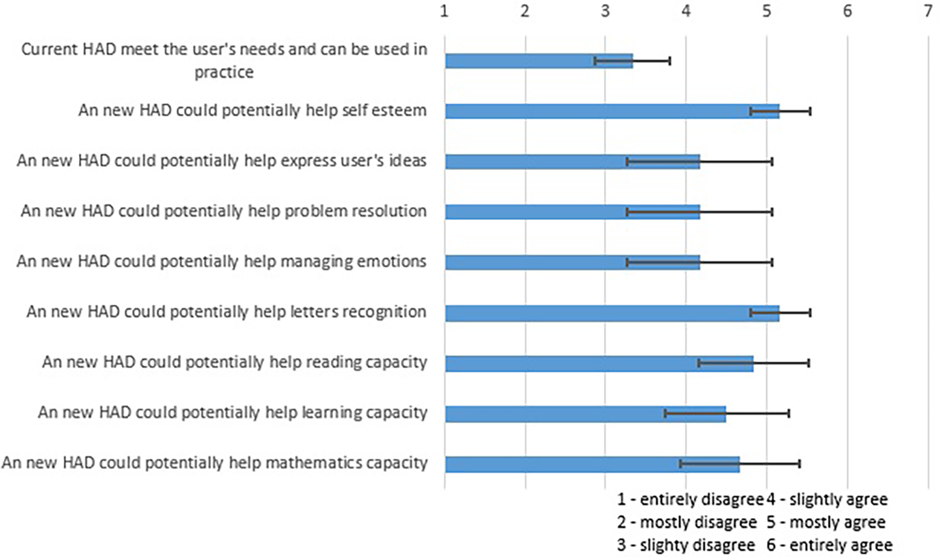 The questionnaire's results are shown in Figure 7 and present the mean and the variance for each question. Results from this questionnaire showed that, in the opinion of the participants, the current HADs did not meet the user's needs and could not be used in practice. The figure also shows that, according to them, a new HAD could be beneficial for potential users in many facets of their lives. The occupational therapists also thought that the proposed device would be easily accepted by the parents of potential users as it would help with the handwriting of their children.