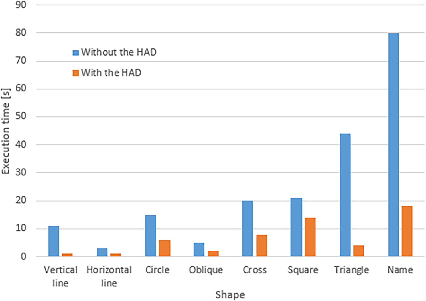 Figure 9 shows that all the shapes were executed faster with the HAD. In general, the execution with the HAD was 4.81 times faster than without the HAD.