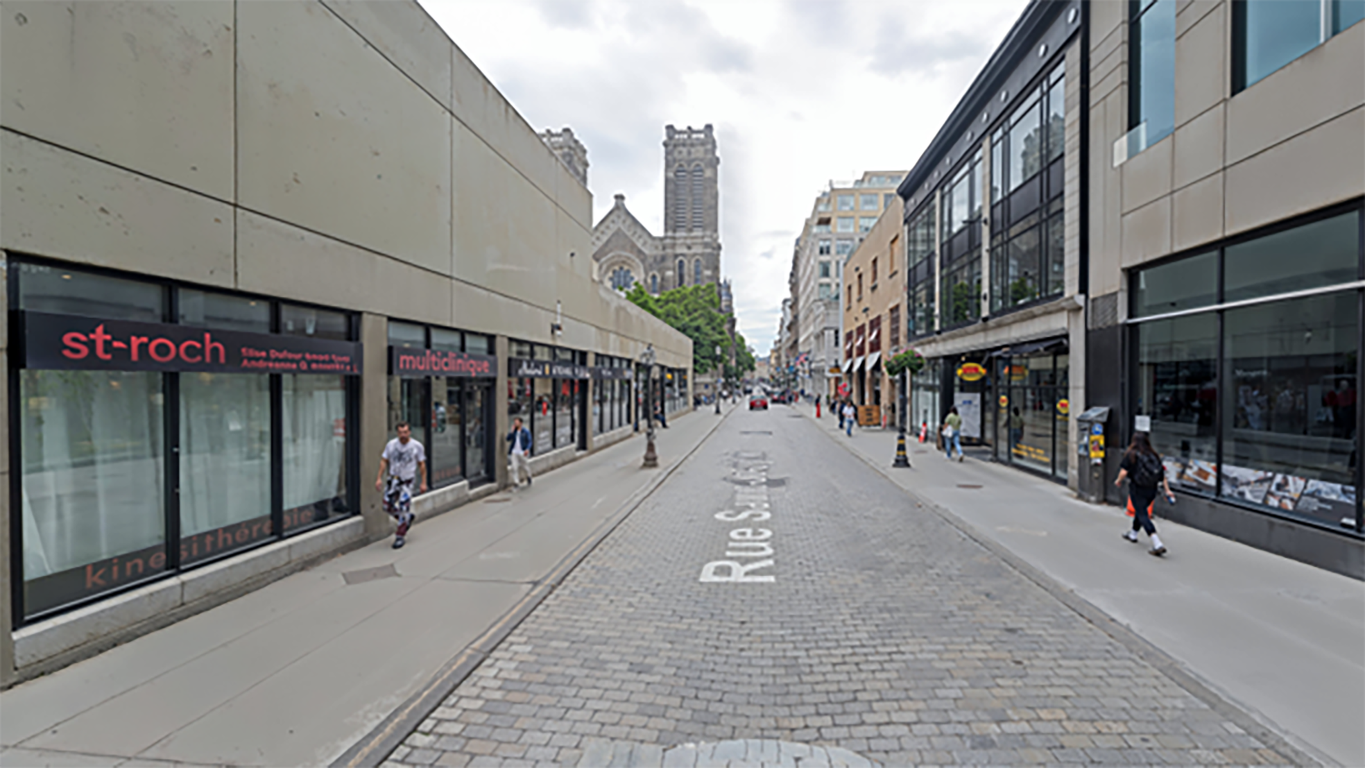 Figure 3 shows the current state of Saint-Joseph Street. The image depicts a street with sidewalks on both the right and left sides, with a noticeable absence of clear demarcation or a safe zone for pedestrians. This lack of defined pedestrian areas highlights the challenges faced in ensuring accessibility and safety for all users.