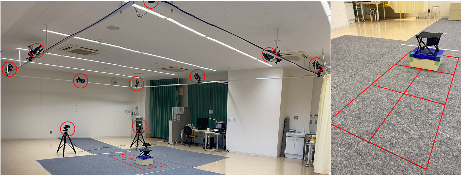 Figure 2. Settings of the experiment. Circles indicate the position of the motion capture camera. Squares indicate the location of the ground reaction force plates. The ground reaction force plates were arranged in a 2 × 3 configuration. Chairs were placed at the edges of the two rear ground reaction force plates.