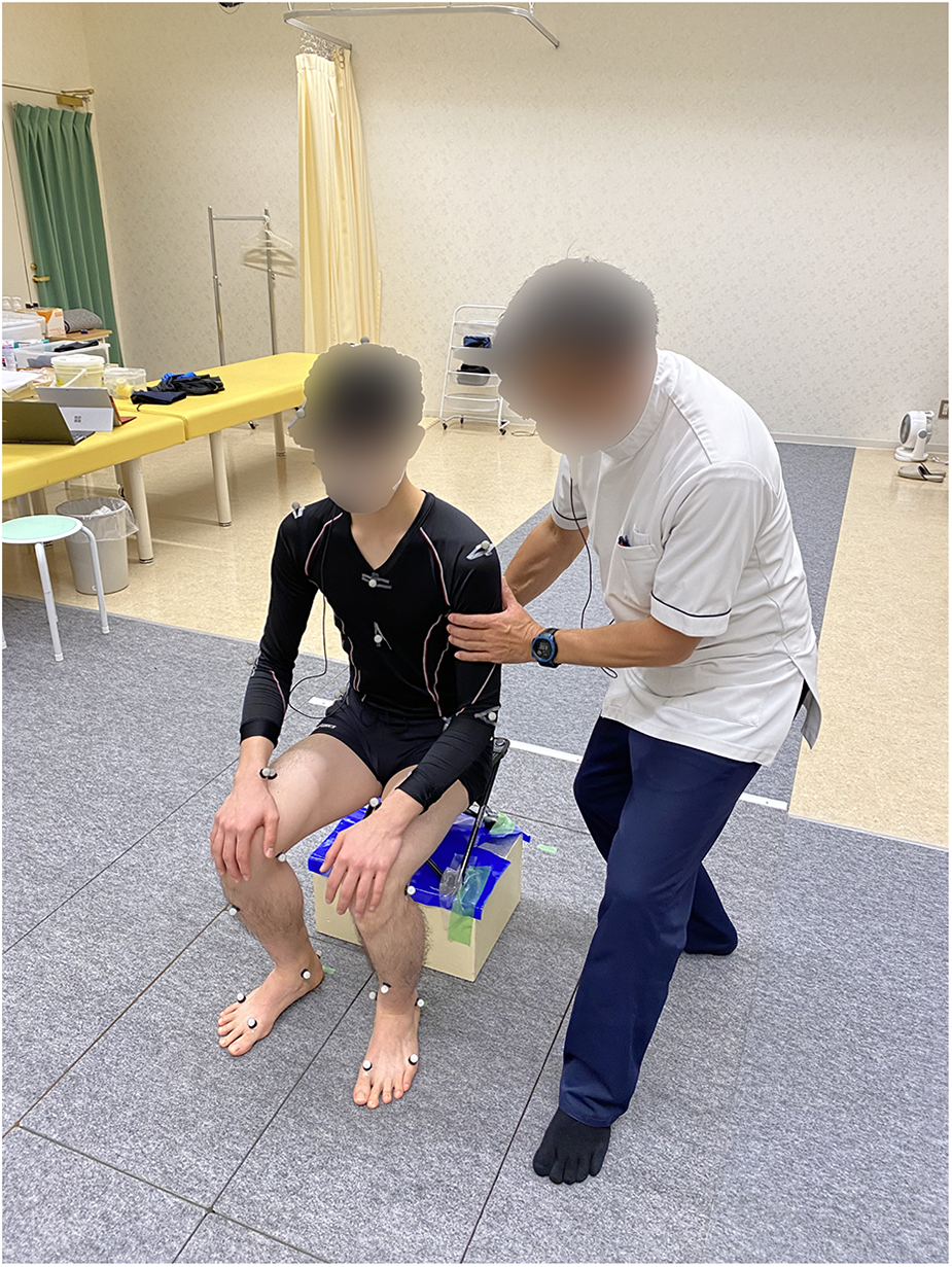 A three-dimensional motion analyzer consisting of eight optical reflection cameras (T-20S camera, VICON) and two optical reflection cameras (Vero2.2 camera, VICON) and six ground reaction force plates (AMTI, 400 mm × 600 mm) were used to measure the motion. A chair with a height of 41.5 cm was placed on top of the two rear ground reaction force plates. The sampling frequency of the three-dimensional motion analyzer was 100 Hz and that of the ground reaction force plates were 1,000 Hz. The data obtained from the three-dimensional motion analyzer and the ground reaction force plates were synchronized on the computer. The data sampled from the ground reaction force plates was downsampled from 1,000 Hz to match the timestamp of the motion analyzer data, resulting in a temporal resolution of 10 ms. The timing of the start and end of each experiment was determined by the Motion Analyzer signal, and calibration was performed before each experiment.