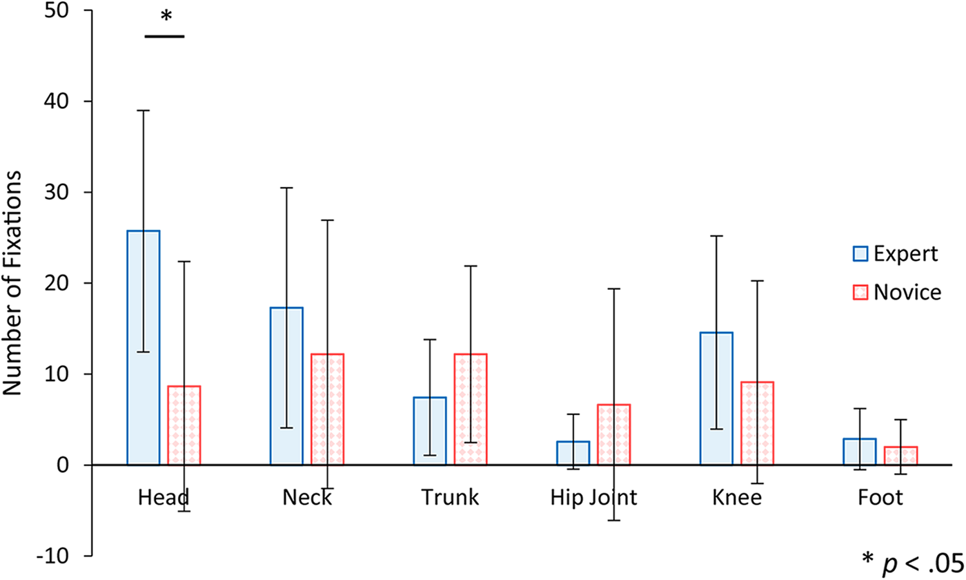 Figure 9. The number of fixations to AOI for expert and novice participants. Error bars indicate standard deviation. Statistical analysis showed that there was a significant difference between experts and novices in the head region.
