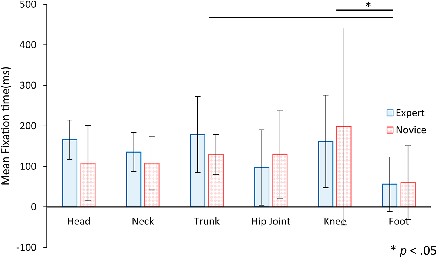 Figure 10. The mean fixation time to AOI per visit for expert and novice participants. Error bars indicate standard deviation. Statistical analysis showed significant differences between trunk and foot, and between knee and foot.