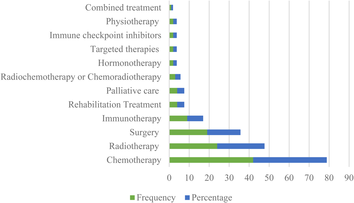 The evaluation of ePROM according to the type of cancer treatment is shown in Figure 5. In terms of the types of treatments, 114 treatments had been found and chemotherapy was the most commonly reported treatment, followed by radiotherapy and surgery.