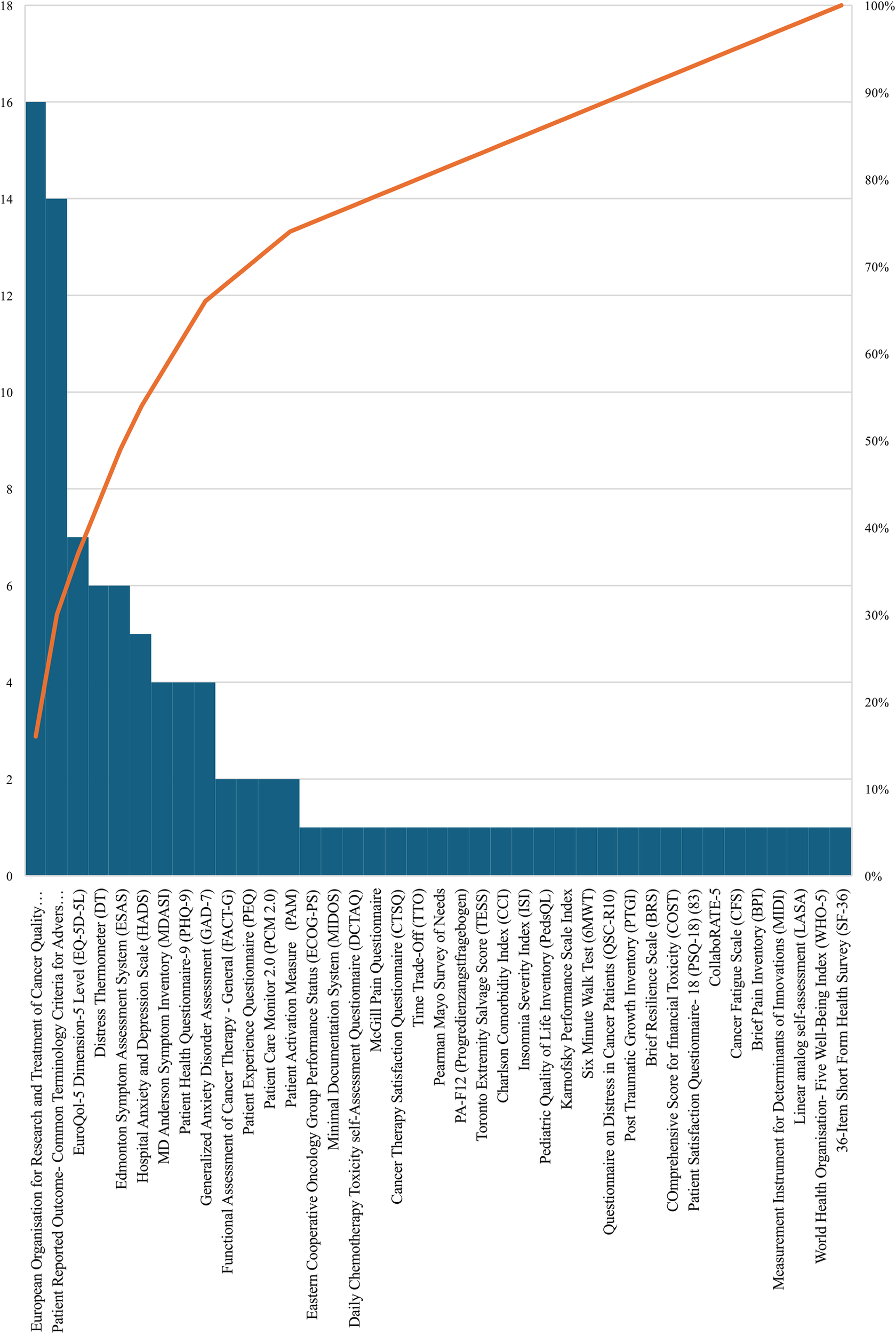 This systematic review identified a diverse range of tools, questionnaires and measurements designed to capture patients’ symptoms and outcomes in ePRO in cancer. According to Figure 6, the most frequently referenced measurements were the European Organisation for Research and Treatment of Cancer Quality of Life Questionnaire Core 30 (EORTC QLQ-C30) contributing valuable insights into the physical, psychological, and social functions of cancer patients (14–29) and the Patient Reported Outcome-Common Terminology Criteria for Adverse Events (PRO-CTCAE) (29–42), providing a comprehensive approach to monitoring symptoms associated with various cancer treatments, each cited in 16 and 14 studies across different cancer types and treatment modalities, respectively.
