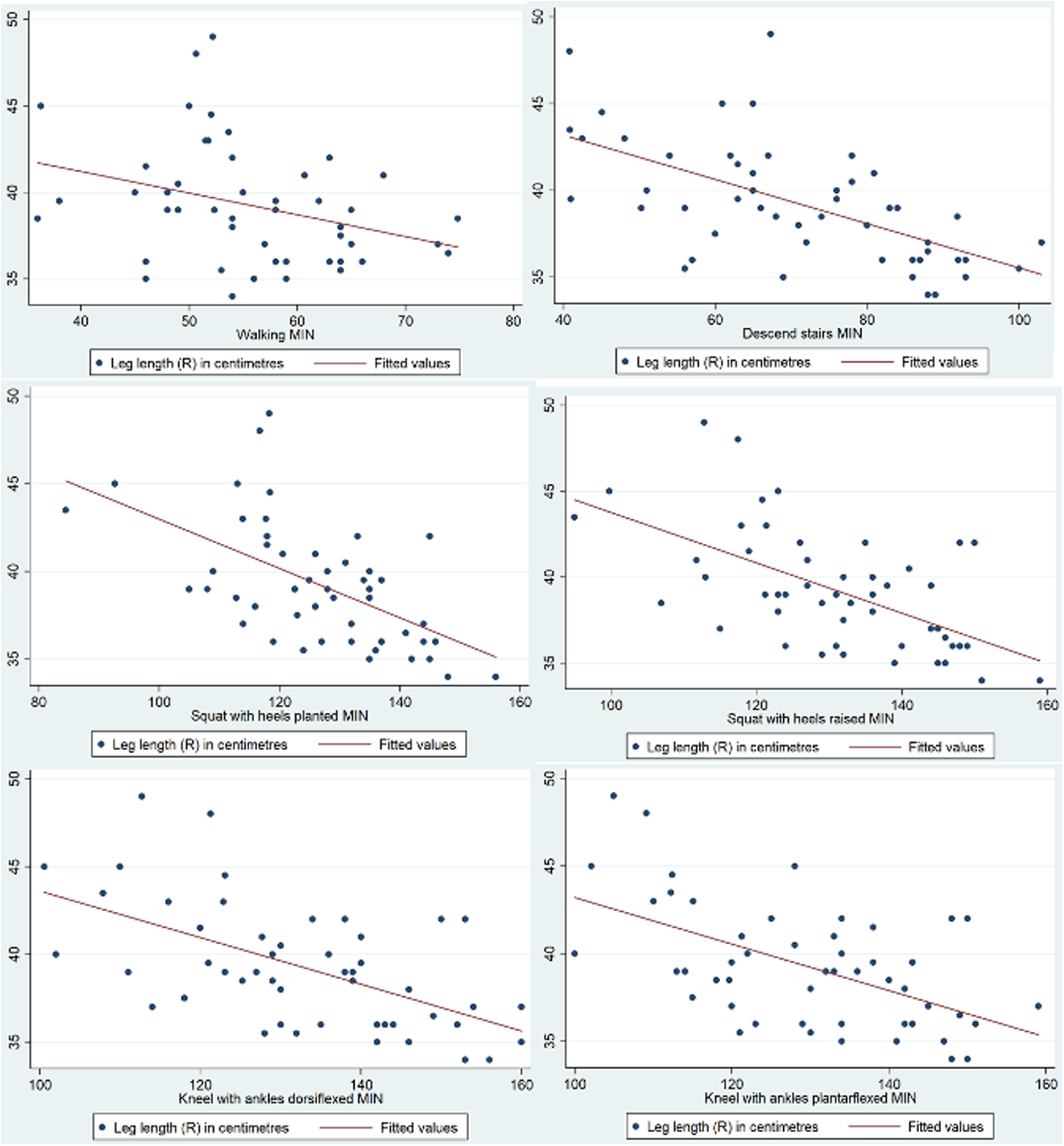 Further analysis was performed to evaluate the association between knee ROM during various activities and the anthropometric measurements of the participants. Leg length was a statistically significant factor affecting knee ROM when walking on flat ground [R(48) = −0.317, p = 0.0248], descending stairs (p < 0.001, 95% CI −5.47 to −2.15), squatting with heels planted (p = 0.001, 95% CI −3.79 to −1.13), squatting with heels raised (p = 0.001, 95% CI −3.73 to −0.954), kneeling with ankles dorsiflexed (p < 0.001, 95% CI −4.62 to −1.98), and kneeling with ankles plantarflexed (p < 0.001, 95% CI −4.57 to −1.47). A graphical representation of the correlation is shown in Figure 5. Lower limb length was also identified as a statistically significant factor affecting knee ROM when kneeling with ankles dorsiflexed (p = 0.035, 95% CI 0.0690–1.83) and ankles plantarflexed (p = 0.028, 95% CI −0.108 to 1.77). A graphical representation of the correlation is shown in Figure 6. Finally, calf circumference was another statistically significant factor affecting knee ROM when squatting with heels planted (p = 0.010, 95% CI −2.74 to −0.387), heels raised (p = 0.012, 95% CI −3.34 to −0.429), and kneeling with ankles dorsiflexed (p = 0.013, 95% CI −3.32 to −0.405). A graphical representation of the correlation is shown in Figure 7.