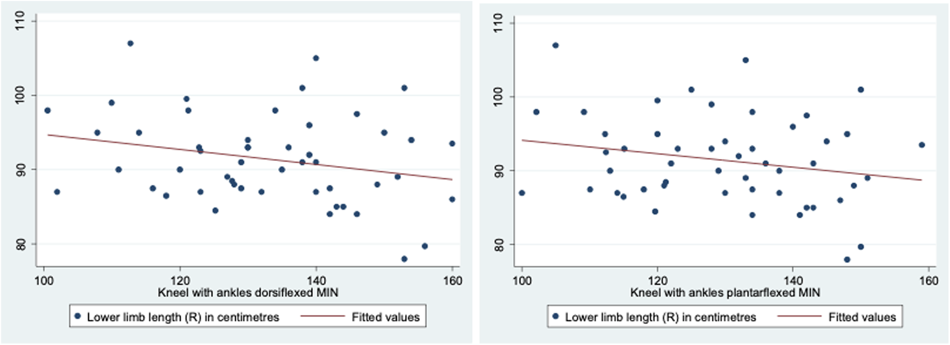 | Kneel with ankles plantarflexed | 130 (14.4) | 130 (14.3) | 129.5 (15.1) | Lower limb length: p = 0.028 (95% CI 0.108–1.77) Leg length: p < 0.001 (95% CI −4.57 to −1.47) |