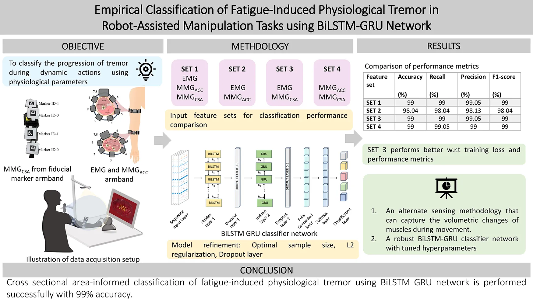 Palani P, Panigrahi S, Renganathan G, Kurita Y and Thondiyath A (2025) Empirical classification of fatigue-induced physiological tremor in robot-assisted manipulation tasks using BiLSTM-GRU network. Front. Rehabil. Sci. 6:1474203. doi: 10.3389/fresc.2025.1474203