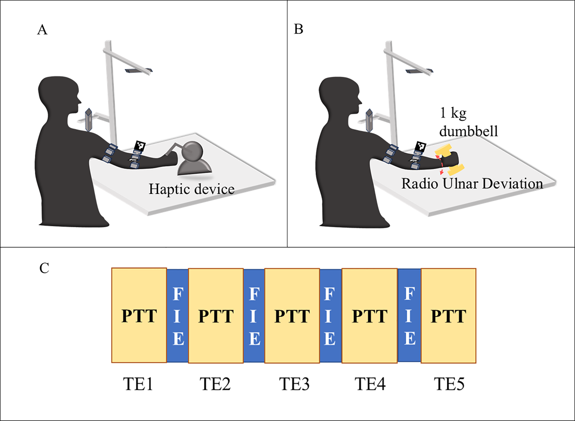 Illustration of the experiment protocol (A) pattern tracing task (PTT) (B) fatigue inducing exercise (C) flow of the task epochs (TE) with pattern tracing task (PTT) followed by fatigue inducing exercise (FIE) for 5-time.