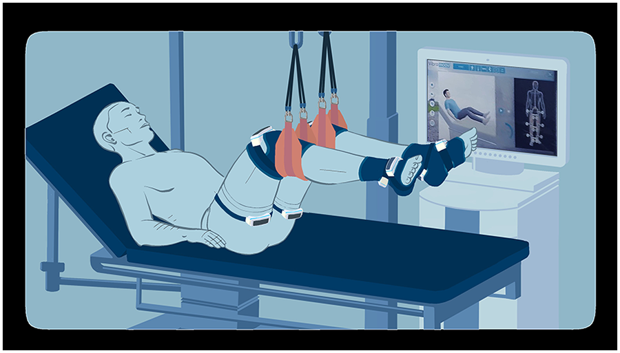 The system's display screen was positioned on the patient's preferred side (or the only possible side), at a distance allowing clear visibility of the avatar. A cloth was used to obstruct the patient's view of their lower limbs.