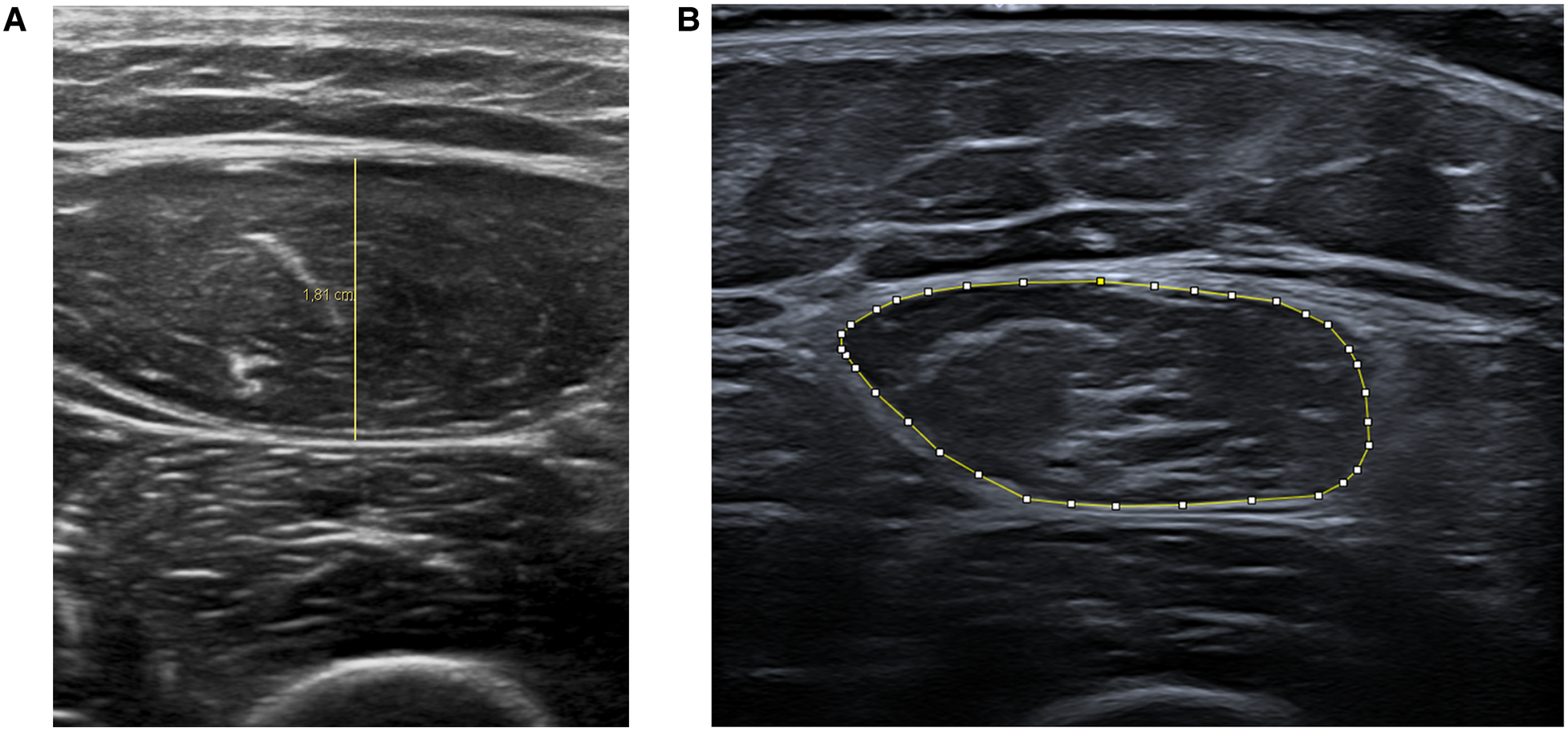 Representative ultrasound images showing rectus femoris muscle thickness (A) and cross-sectional area (B) measurements.