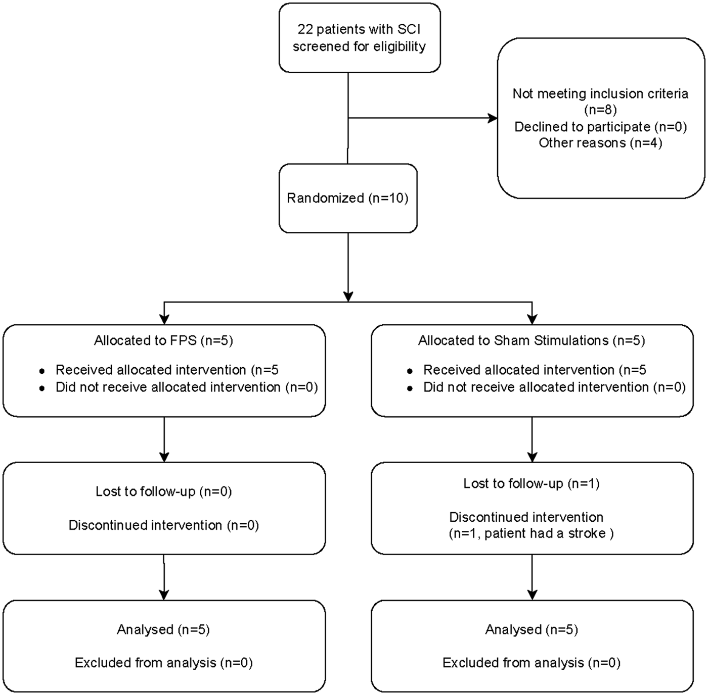 The aim of the present study was manifold. We wanted to examine the safety, feasibility, and effects of an early non-invasive FPS rehabilitation procedure on spasticity and muscle atrophy. To test our hypothesis, we conducted a pilot randomized controlled trial on patients with traumatic SCI. First, we hypothesized that early FPS can be safely applied during the initial ICU stay. Second, we hypothesized that this early intervention might reduce spasticity, mitigate muscle wasting, and promote sensorimotor recovery in tetraplegic and high-level paraplegic patients.
