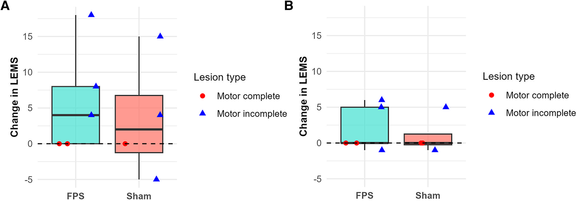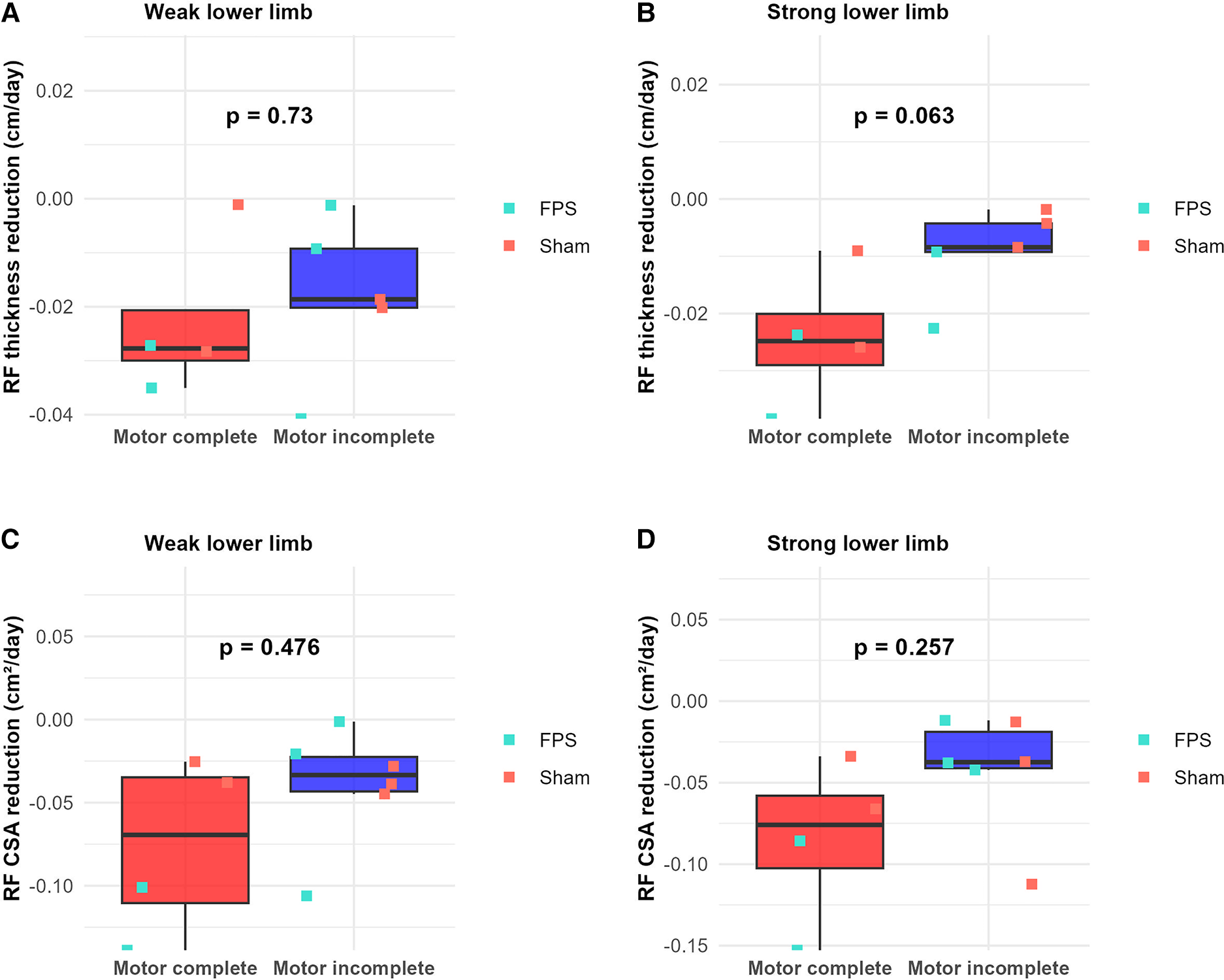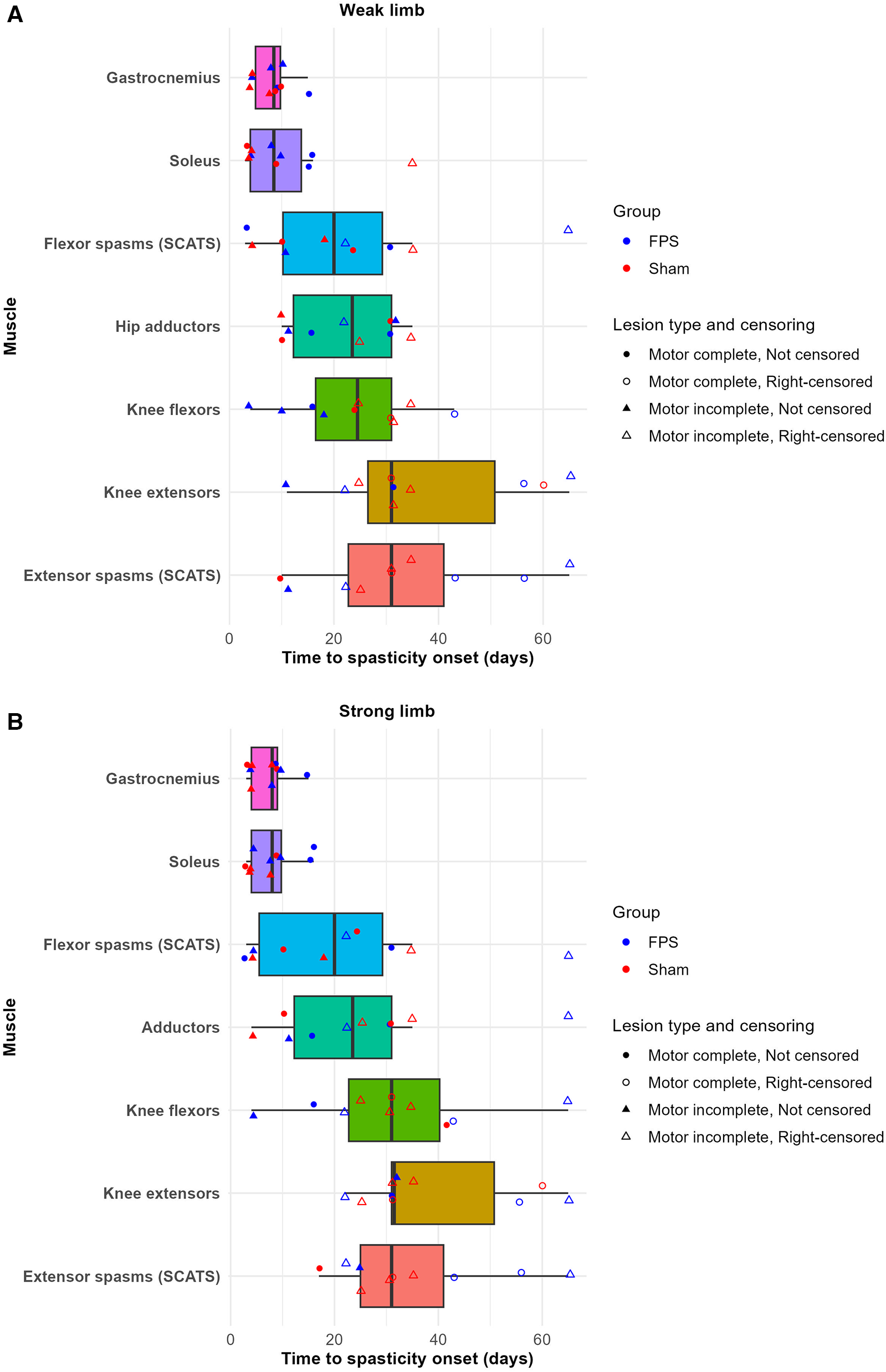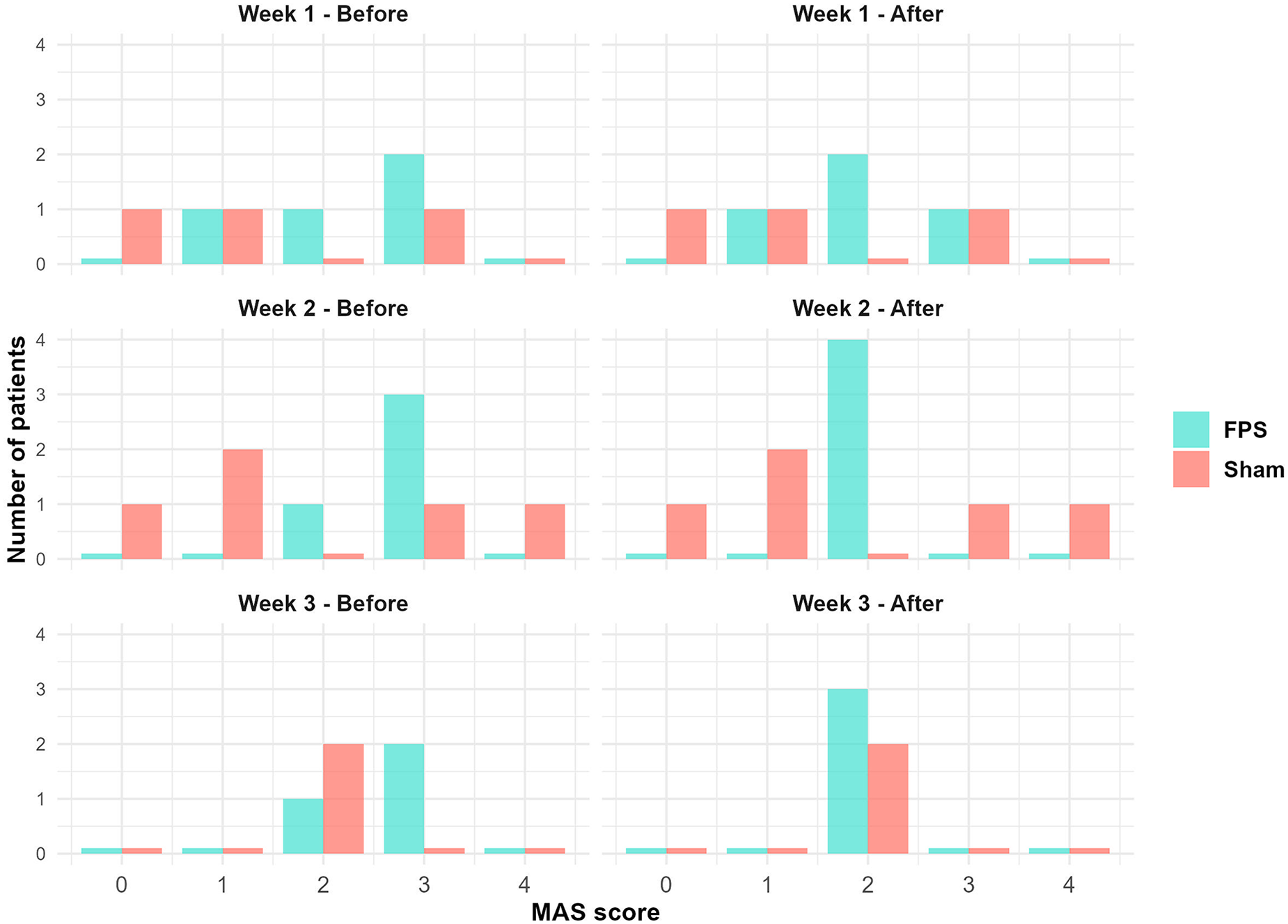 Treatment began early, with a median of 4 days post-injury for both groups. The number of adverse events was similar between groups, with none linked to the intervention. No medium-term effects on spasticity or muscle atrophy could be identified. However, our results show a tendency toward a beneficial short-term effect of FPS on spasticity, observed for all spasticity measurements.