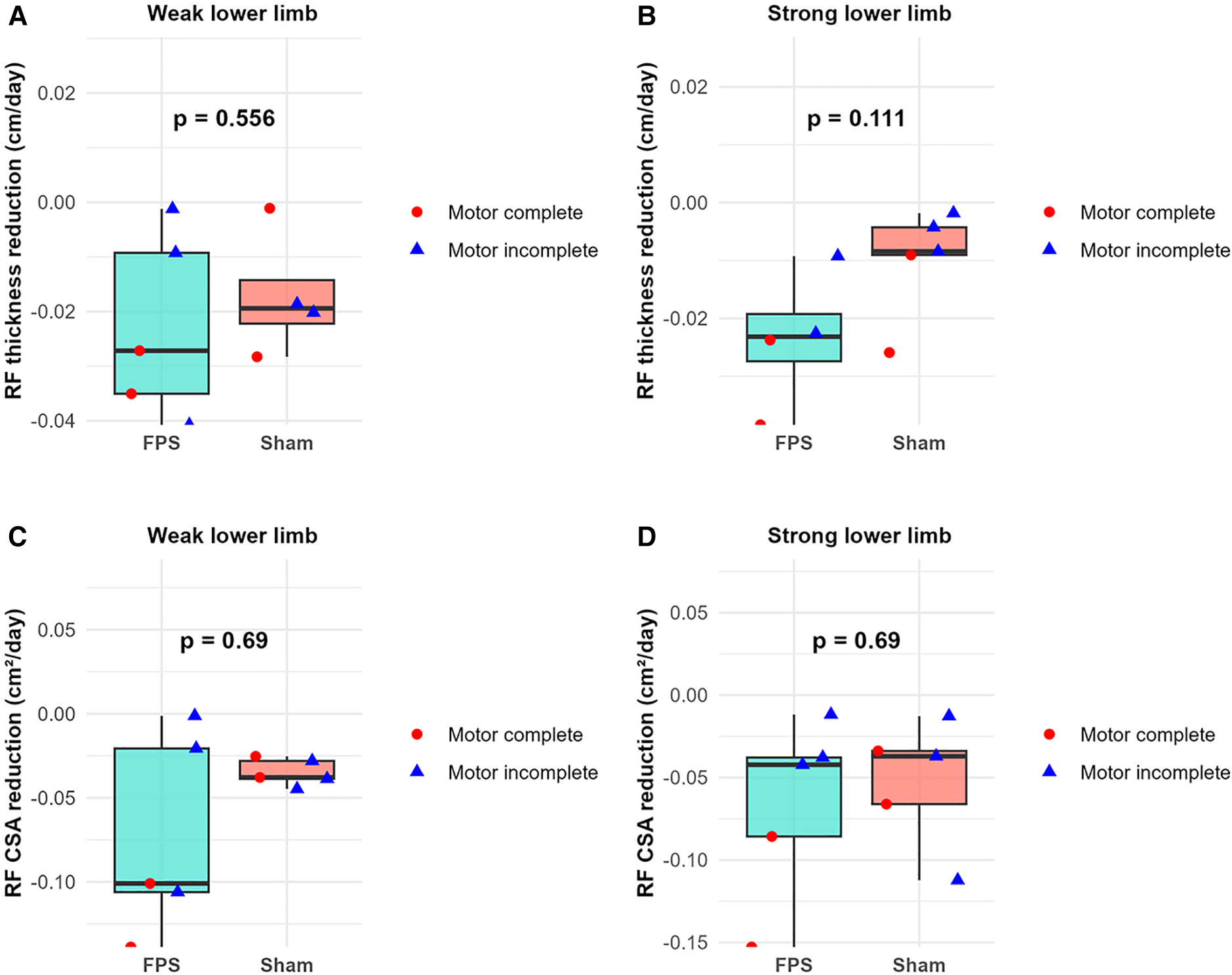 Ten SCI patients were included in this randomized pilot study, with five receiving early FPS and five receiving sham stimulation. Both groups were treated using the Vibramoov, consisting of 12 computer-synchronized vibrators placed on the lower limbs. Treatment sessions lasted 30 min, four times a week, for up to 8 weeks. Spasticity was assessed using the Modified Ashworth Scale, Tardieu Scale, Spinal Cord Assessment Tool for Spastic Reflexes, and a patient self-evaluation with a visual analog scale. Muscle atrophy was evaluated through ultrasonography of rectus femoris thickness and cross-sectional area. The duration of the follow-up period ranged from 6 months to 1 year.