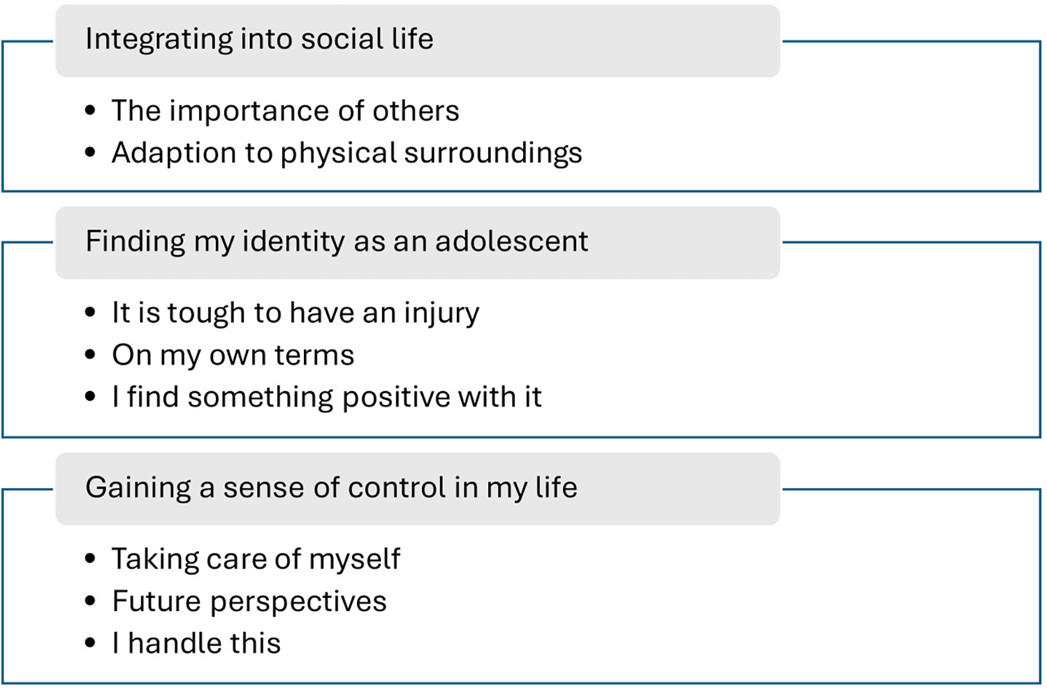 Three key themes were identified. Theme 1, “integrating into social life,” highlighted the importance of supportive social networks, with peers and family playing crucial roles. Theme 2, “finding an identity as an adolescent,” underscored the impact of the disability on the adolescent's identity and pursuit of independence. Theme 3, “gaining a sense of control in life,” illustrated strategies for self-care, socializing, and managing physical and psychological challenges.