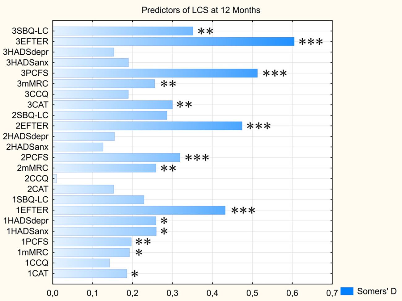 Predictive value of assessed scores for persistence of LCS symptoms at 12 months. Parameters’ prefixes indicate the visit No. CAT, COPD assessment test; CCQ, Clinical COPD questionnaire; EFTER, EFTER-COVID study physical symptoms subscale; HADSanx, Anxiety subscale of Hospital Anxiety and Depression Scale; HADSdepr, Depression subscale of Hospital Anxiety and Depression Scale; MRC, Medical Research Council dyspnea scale; PCFS, Post-COVID-19 Functional Status scale; SBQ-LC, Symptoms Burden Questionnaire – Long COVID Memory, Thinking and Communication subscale. * - p < 0.05, ** - p < 0.01, *** - p < 0.001.
