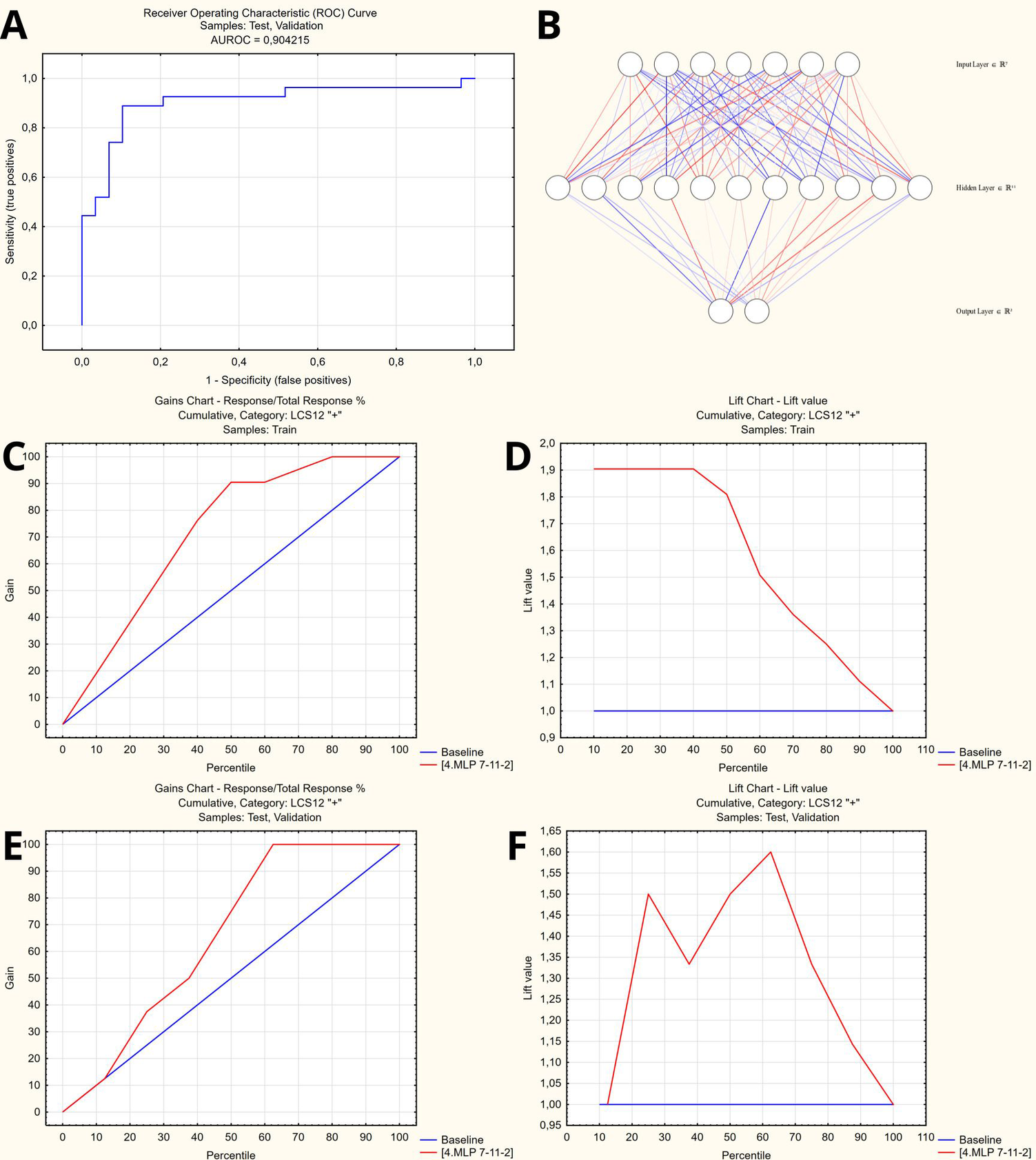 For the patients who remained symptomatic, the optimal set of predictors included age, EFTER-COVID Physical symptoms, SBQ-LC Memory, Thinking and Communication, MRC Dyspnea, and CAT scores. The comparative summary of predictive performance of the resulting binary classification models using various machine learning methods is presented at Table 2. The optimal model that outperformed alternative approaches was utilizing SANN 7-11-2 architecture and is available in open access at https://doi.org/10.5281/zenodo.14703690. It yielded a 88% accuracy in the test/validation subset of the study cases, translating (given 24% of completely recovered patients at 3 months) into the 91% overall predictive accuracy in the final study cohort – see Figure 6 for the model characteristics, and supplementary material for instructions and detailed model architecture (refer to Supplementary Table S3 for network weights and connections).