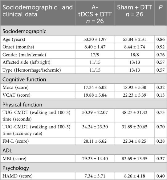 This study included 52 adult stroke patients who were recruited from the Rehabilitation Department of the Second Affiliated Hospital of Kunming Medical University Hospital. There were 17 female, 35 male in two groups in total. Demographic data of participants as shown in Table 1. There were no significant difference between sociodemographic, cognitive, physical ADL, and mood parameters between the tDCS + DTT group and Sham + DTT group (p > 0.05; Table 1).
