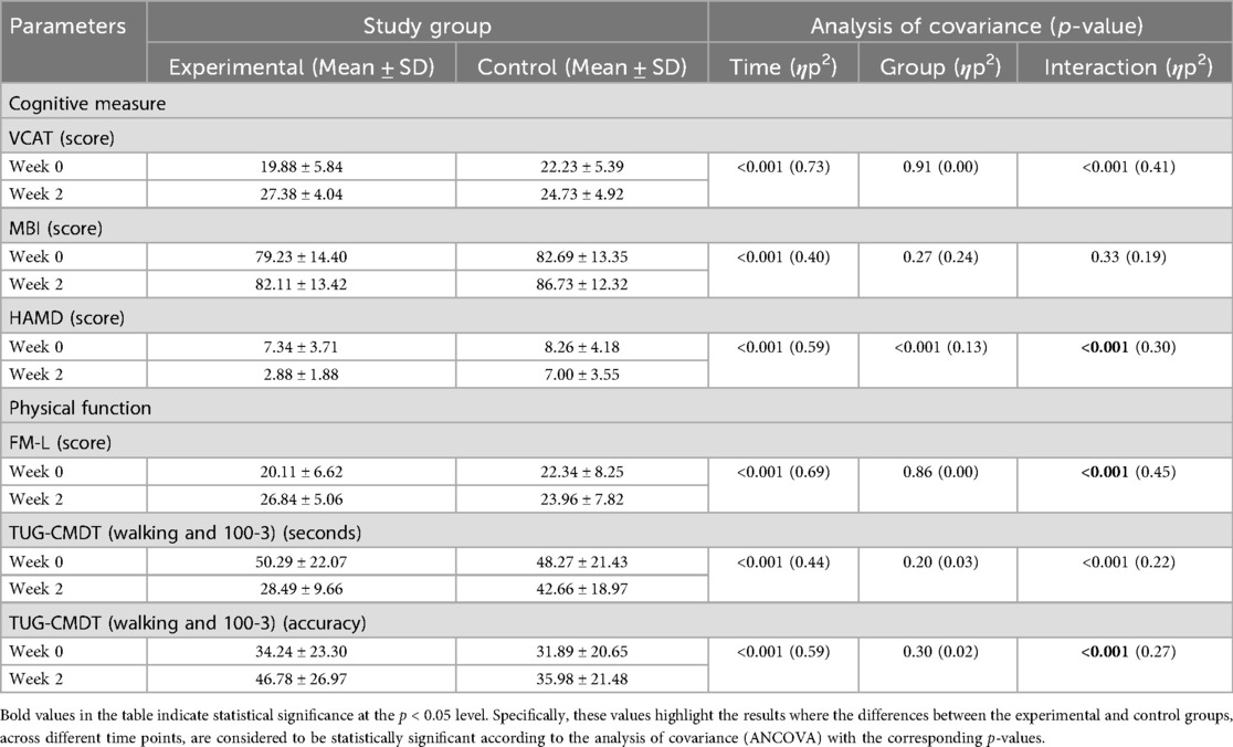 Table 2 was showen about main effect of time, group, and time–group interaction of the interventions on the physical, cognitive, ADL and mood functions. VCAT revealed significant effects of time (p < 0.001) and group (p = 0.911), with a significant interaction effect (p < 0.001). MBI scores indicated significant effects of time (p < 0.001), group (p = 0.27), and interaction (p = 0. 33). HAMD scores revealed significant effects of time (p < 0.001), group (p < 0.000), and interaction (p < 0.001). FM-L scores showed significant effects of time (p < 0.001), group (p = 0.86), and interaction (p < 0.001). TUG-CMDT time revealed significant effects of time (p < 0.001), group (p = 0.20), and interaction (p < 0.001). TUG-CMDT accuracy rate results showed significant effects of time (p < 0.001), group (p = 0.30), and interaction (p < 0.001).
