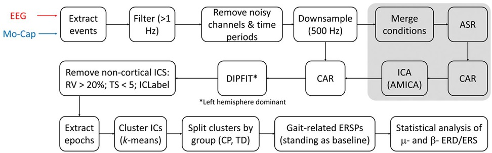 Figure 1. Processing steps for analyzing the differences in motor-related cortical activity between groups (typical development [TD], cerebral palsy [CP]) and walking conditions (with and without 20% BWS) from scalp-recorded EEG.
