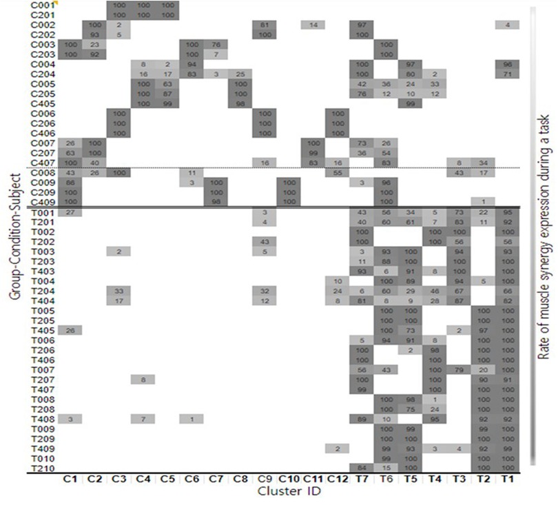 Nineteen distinct clusters across all participants and conditions were identified. Muscle activation patterns for each cluster are shown in Supplementary Figure S1. To determine whether a cluster was specific to the TD or CP group, the proportion of synergies for each cluster was calculated using the two-proportion z-test. Based on these values, 12 CP-specific clusters and 7 TD-specific clusters were identified (Figure 2). Of the 12 CP clusters, 6 were present in both groups (C1, 3, 4, 6, 9, 12) whereas the rest were present only in CP (C2, 5, 7, 8, 10, 11). Clusters C8, C10, and C11 were predominantly observed in participants CP5, CP9, and CP7, respectively, indicating that these clusters may be subject specific. Of the 7 TD clusters, all were present in both groups and there were no TD clusters that were subject specific.