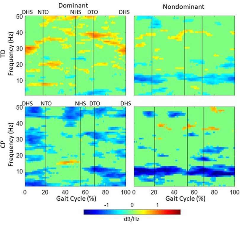 Figure 4. Relative ERD/ERS over the gait cycle between the 20% BWS and no BWS walking for TD (top) and CP (bottom) groups in the dominant (left) and nondominant (right) sensorimotor clusters. Negative values indicate larger ERD in 20% BWS. Plots are masked for significance (p < 0.05) with nonsignificant values set to 0 dB.