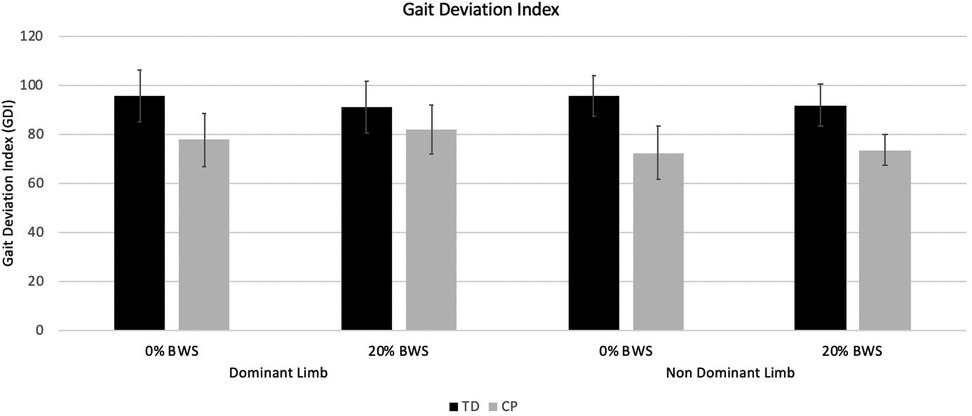 Figure 3. Mean GDI values for the groups with typical development (TD) or cerebral palsy (CP) for the 0% and 20% body weight support (BWS) conditions.