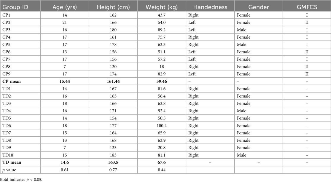 Table 1. Participant characteristics for those with cerebral palsy (CP) and typical development (TD).