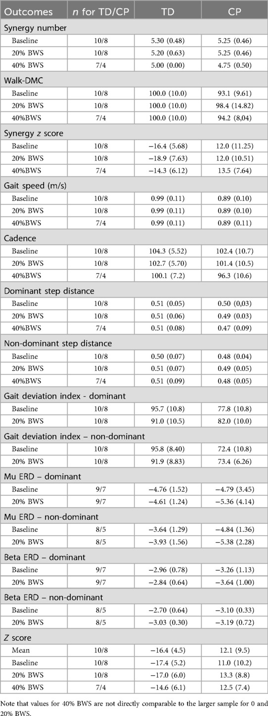 Results: Minimal or no group differences or BWS effects were found for synergy number, structure or Walk-DMC, whereas the Gait Deviation Index (GDI) showed a significant interaction with 20% BWS where the dominant side in CP improved with 20% BWS while both sides in TD worsened. Beta band EEG activation from 0% to 20% BWS showed a significant triple interaction increasing in the non-dominant and decreasing in the dominant hemisphere in TD, while increasing in both in CP. A worsening trend was seen with 40% BWS in all measures except z scores.