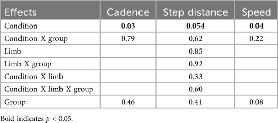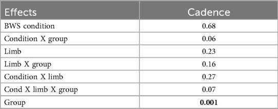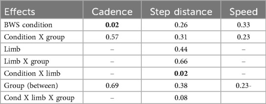 Table 3. General linear mixed model results for the temporal spatial gait measures from the baseline and 20% BWS conditions (bold = p < 0.05).