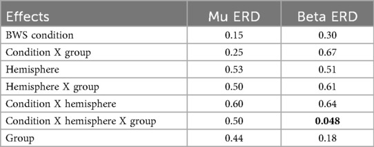 Table 6. General linear mixed model results for the EEG event-related desynchronization (ERD) measures for the alpha or mu and beta frequency bands from the 0 to 20% BWS walking conditions (bold = p < 0.05).