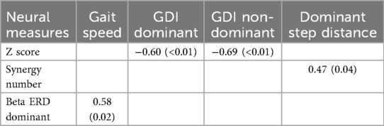 Table 7. Significant correlation and associated p-values between baseline neural and biomechanical measures.