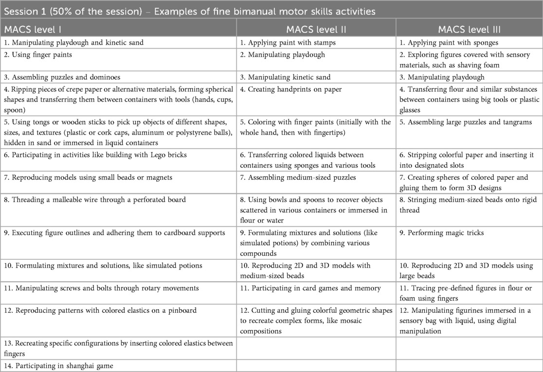 Examples of activities proposed for this session, and fully reported in Table 1, are subsequently adapted to the child's age, interests, motor functional and cognitive level, as well to the theme of the day.