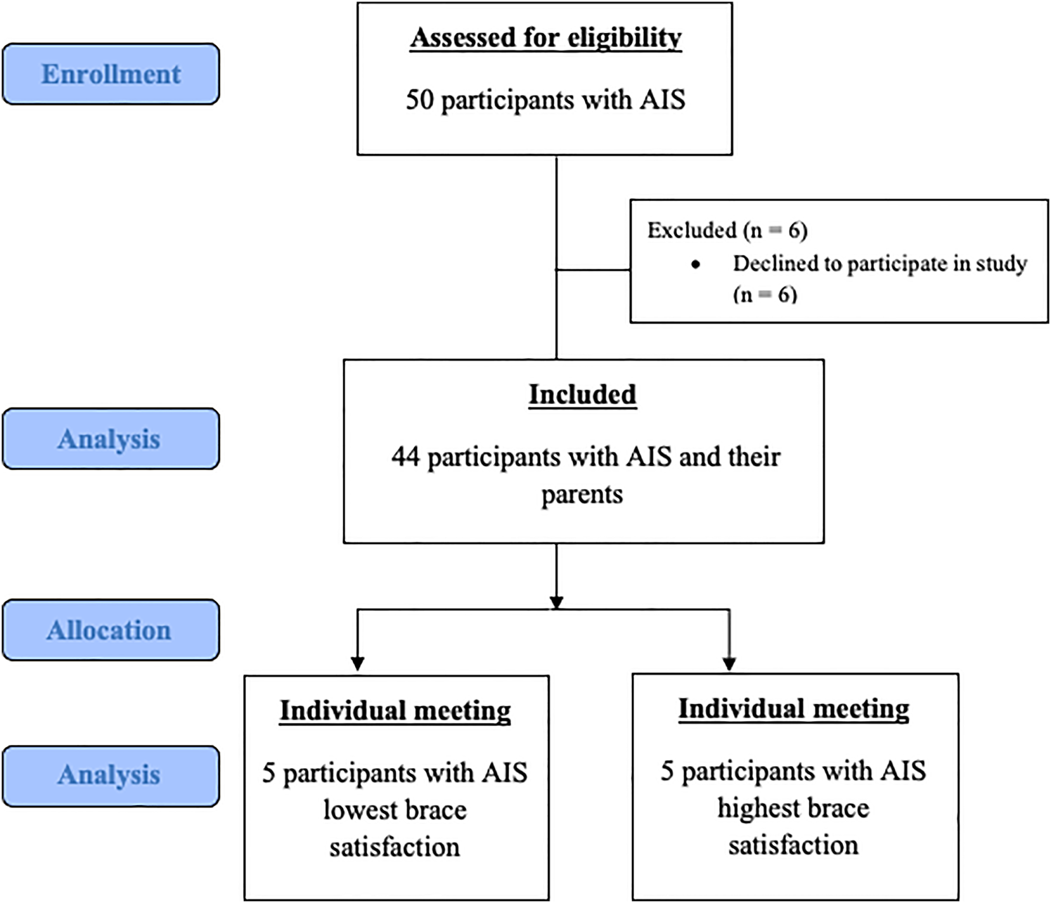 The inclusion criteria for this study were as follows: confirmed AIS diagnosis, brace treatment for at least 6 months, and living with family. Participants with neurological or mental disorders, a history of spine surgery, and parents with mental or vision disorders were excluded from the study. In total, 44 individuals with AIS and their parents who met the inclusion criteria were included in this study. Signed informed consent was obtained from all the participants with AIS and their parents. A flowchart illustrating the selection of participants is shown in Figure 2.